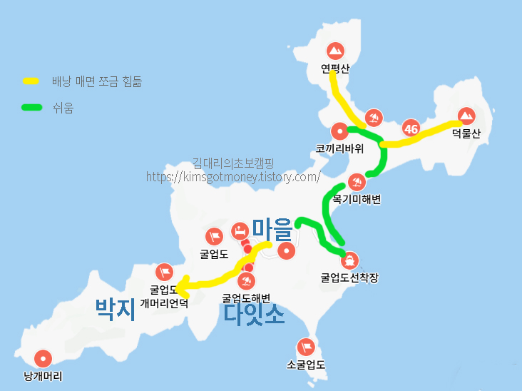 이것은 내가 대강 만든 굴업도 개념도인데, 섬 끝에서 끝까지는 천천히 걸으면 두 시간 정도 될 것 같다.