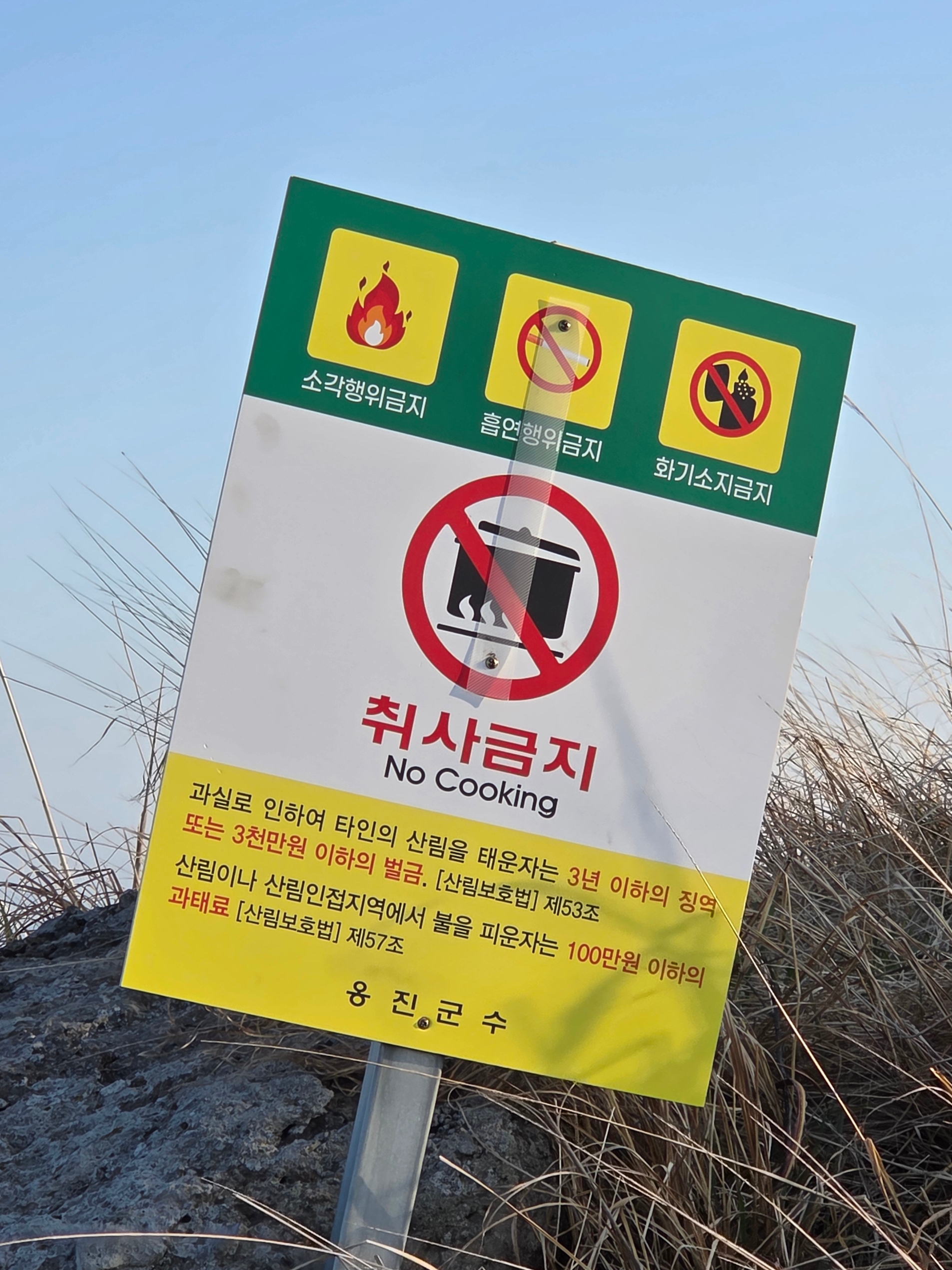 섬 곳곳에 화기 휴대와 취사를 금한다는 팻말이 있다
