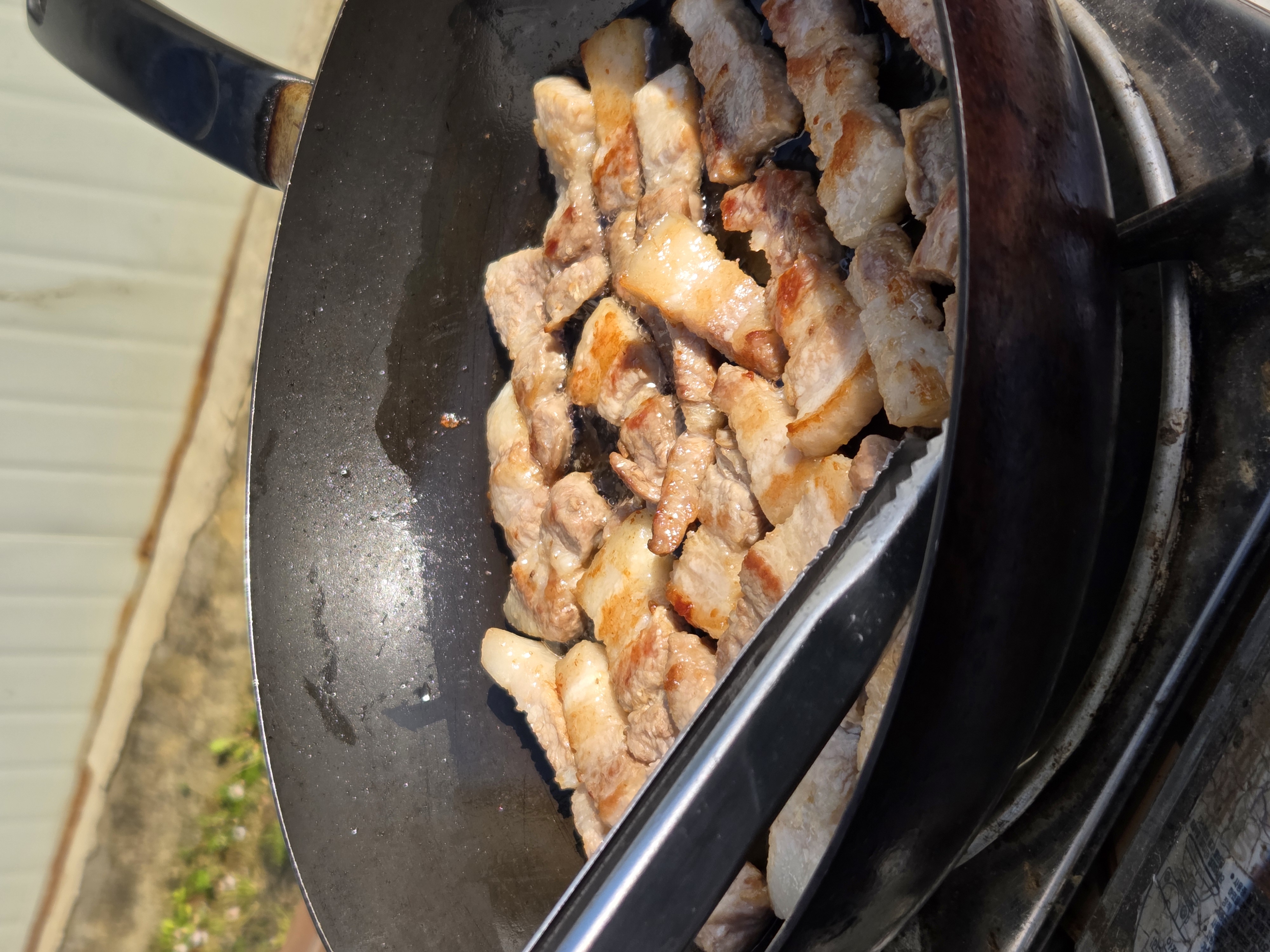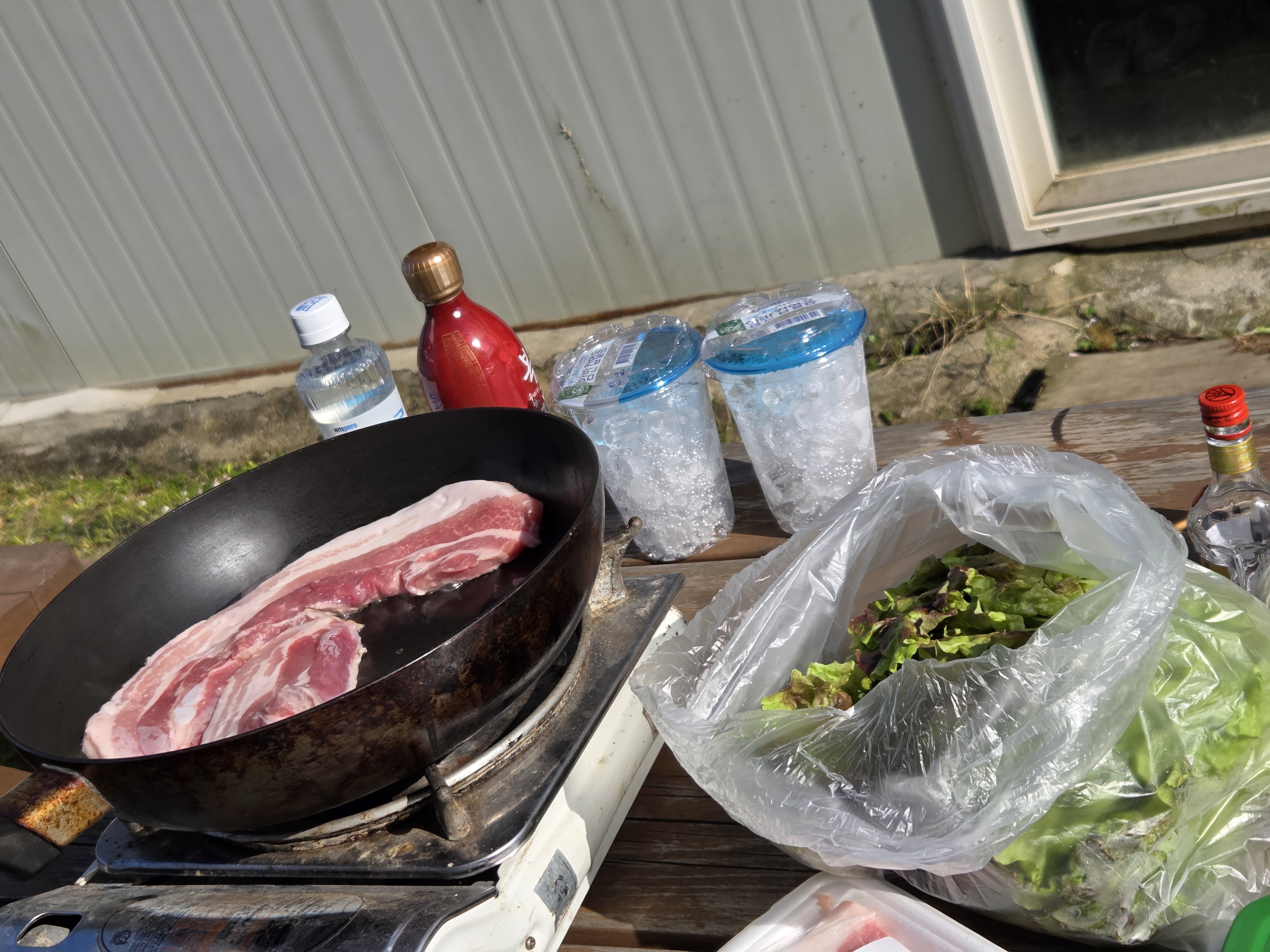 가스버너에 후라이팬에도 삼겹살은 잘 익는다