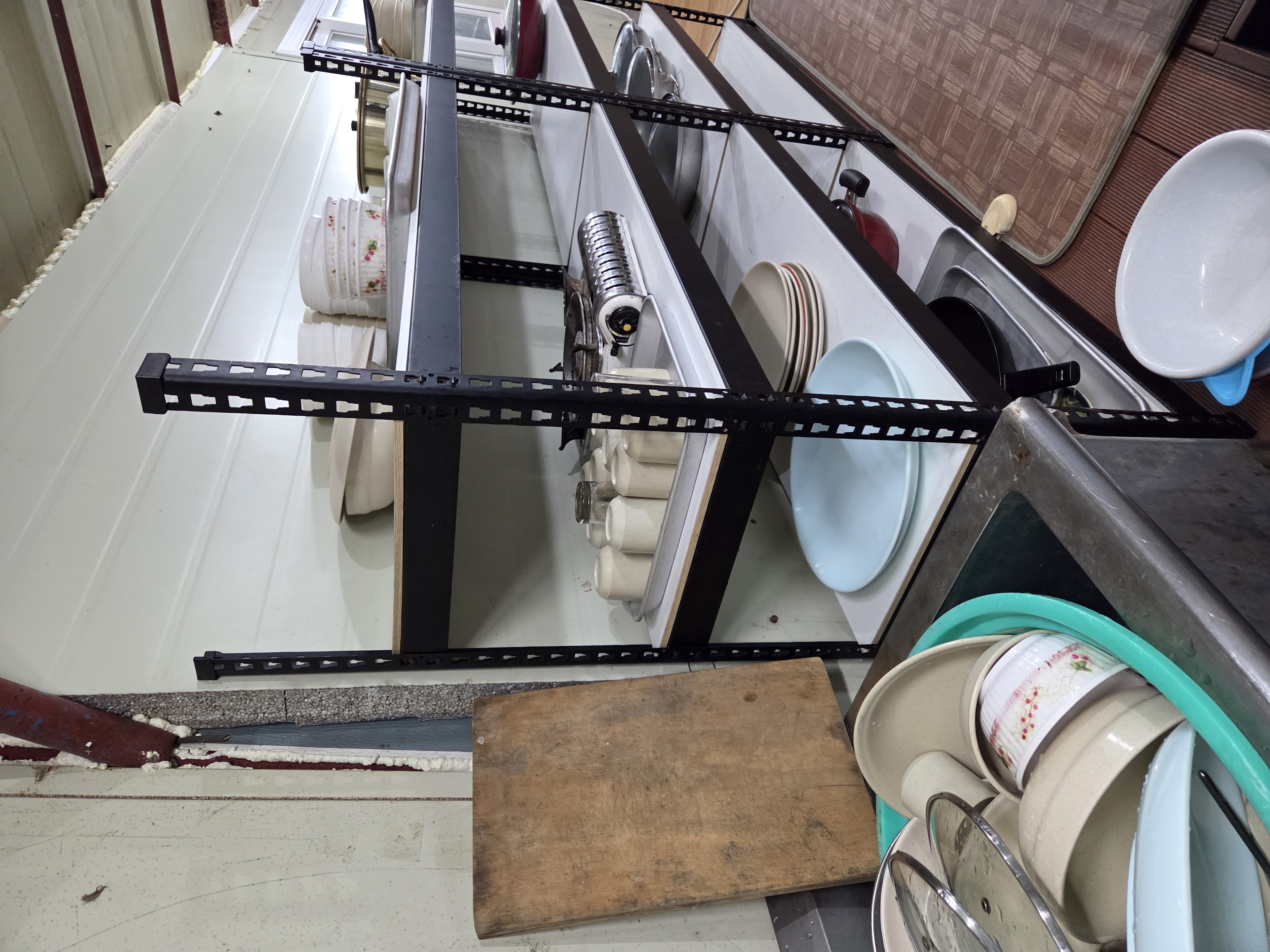 별도로 마련된 주방에는 각종 식기와 가스렌지, 냄비, 후라이팬 등이 마련되어있어서 자유롭게 사용하고 씻어두면 된다.