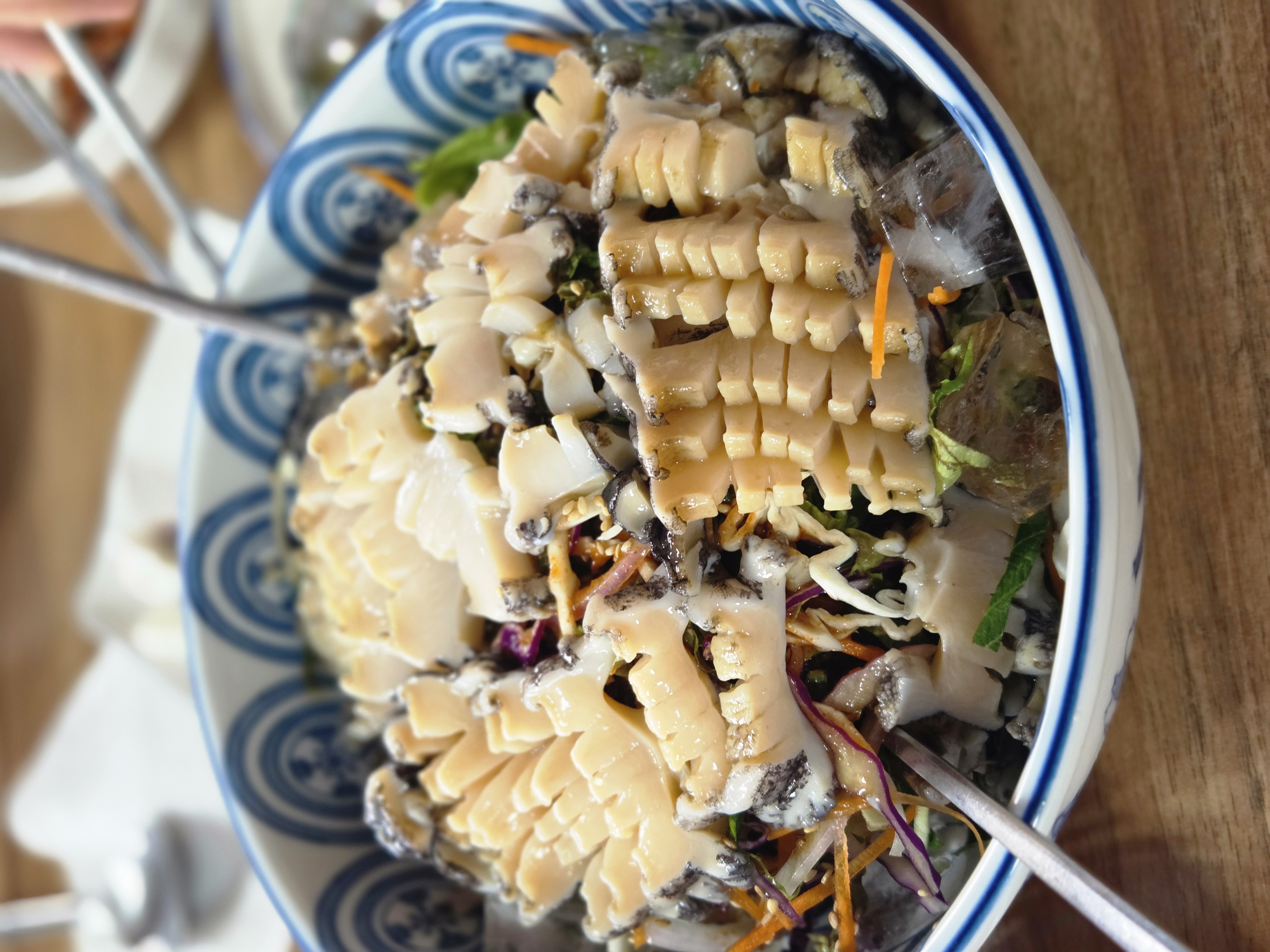 이게 전복 물회인데 면사리 없이 전복과 채소로만 그릇이 가득 찼다.