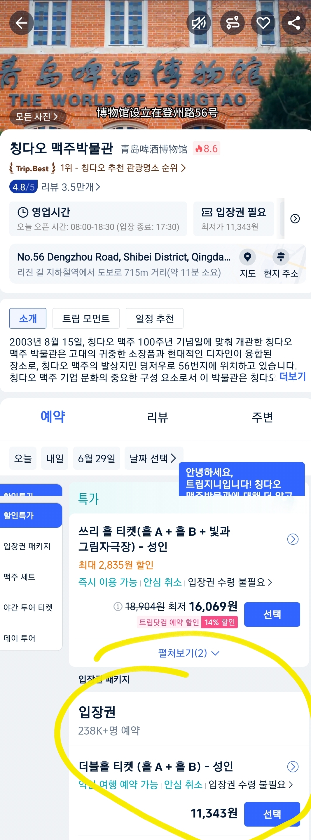 예약 방법 : 트립닷컴 어플에서 맥주박물관 검색하면 바로 표 구입 가능. 나는 하단에 표시된 11,343원짜리 A+B홀 티켓을 구입했다.