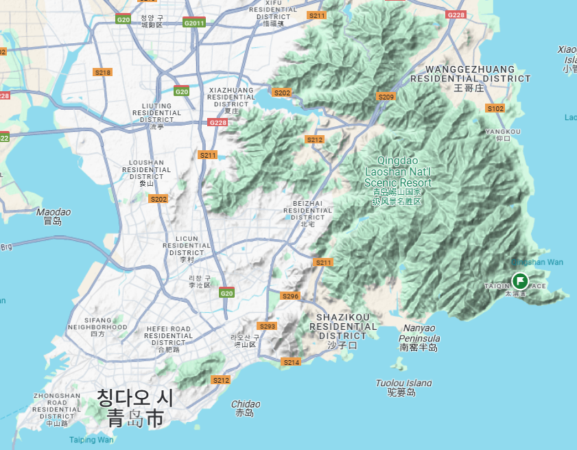 칭다오 지도를 보면 오른쪽에 아주 크게 산지가 자리하고 있다.