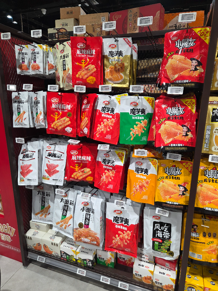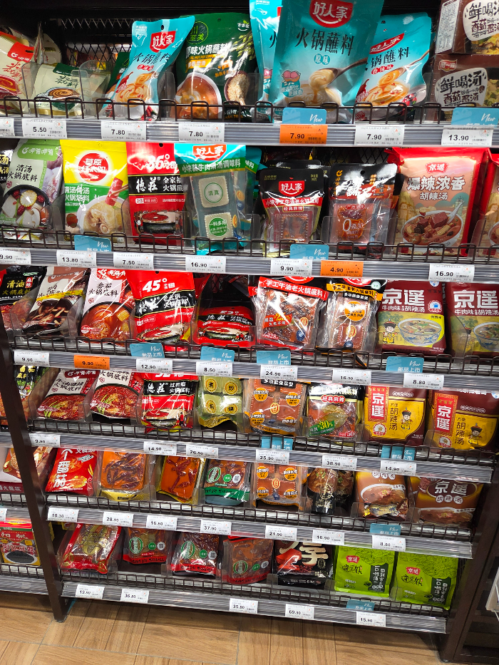 오른쪽 끝 줄에 있는 천엽같이 생긴 납작한것들은 즈마장 (훠궈 땅콩소스)맛인데 국내에는 안판다.