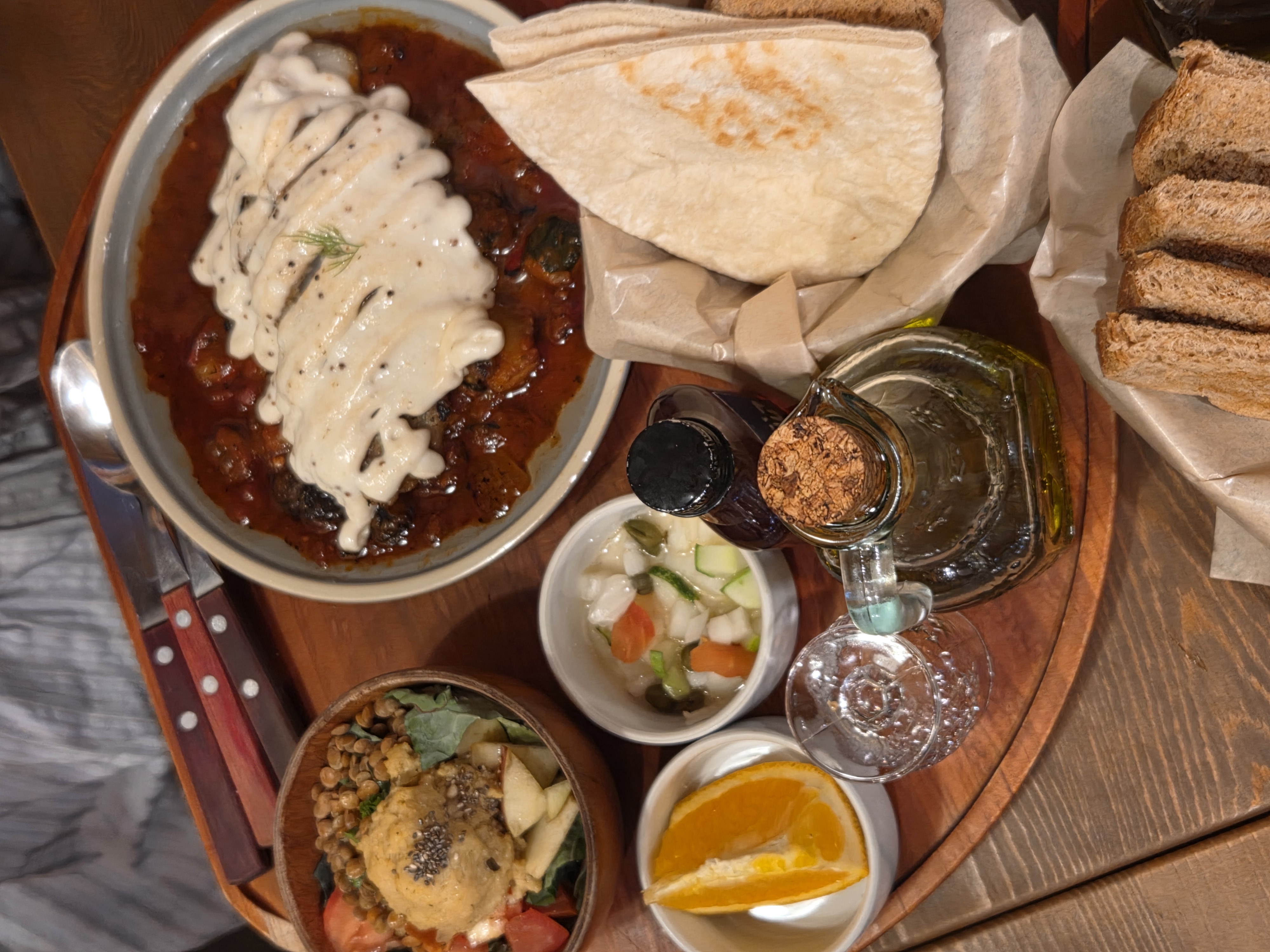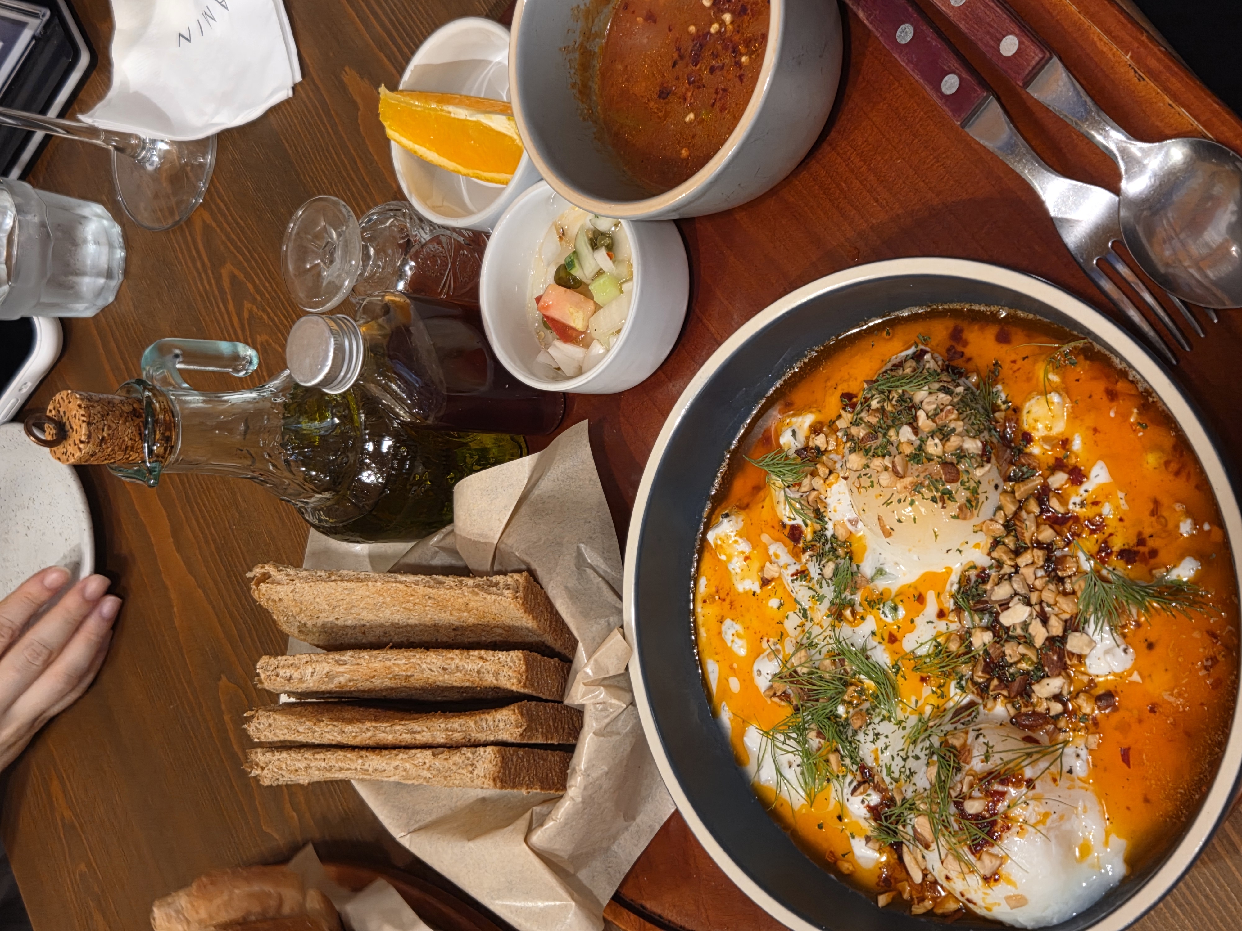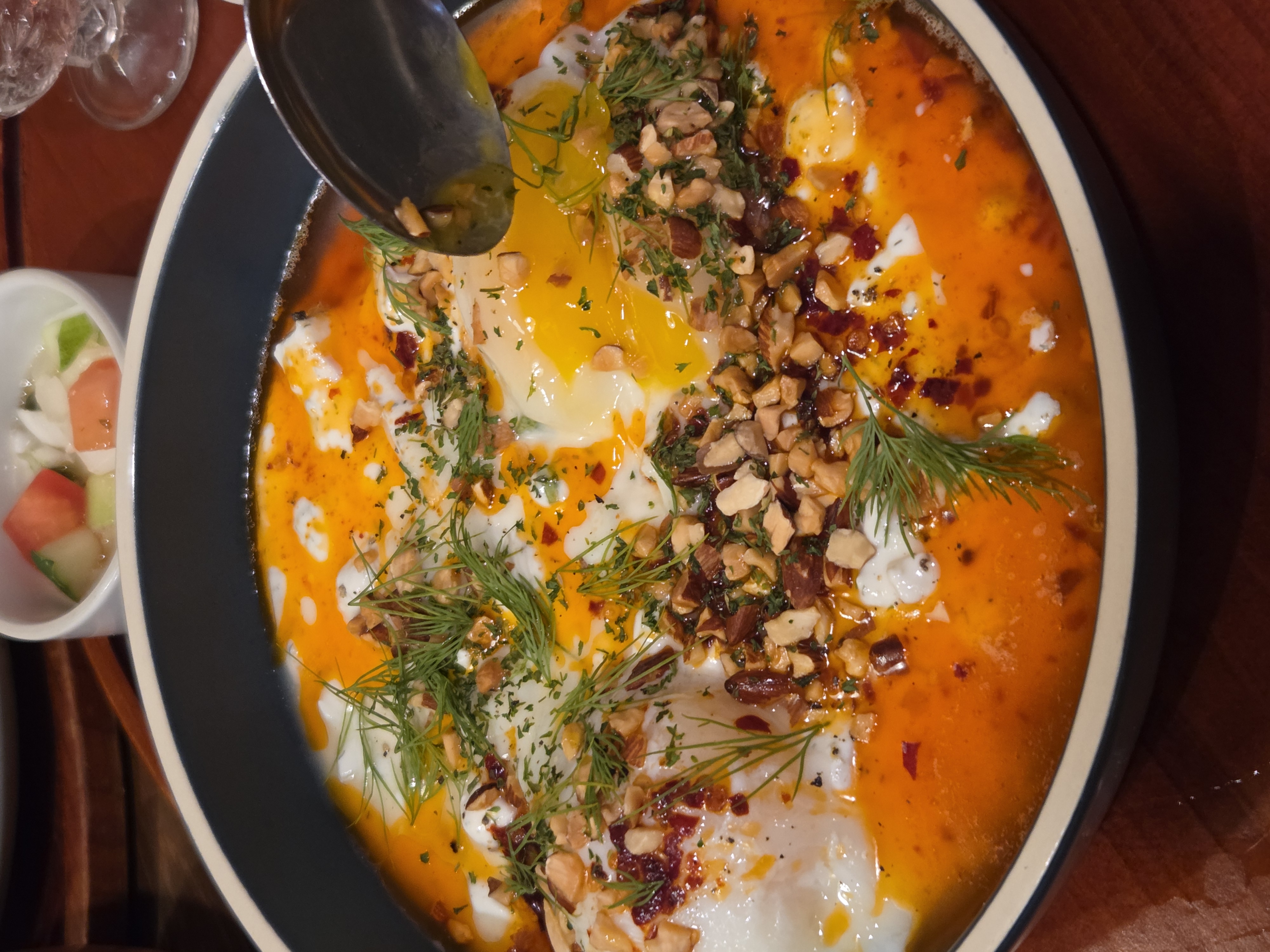 마늘, 레몬즙 등을 넣은 요거트에 수란을 얹고 칠리오일과 견과류, 딜을 뿌려내어 먹는 터키의 아침 식사다.