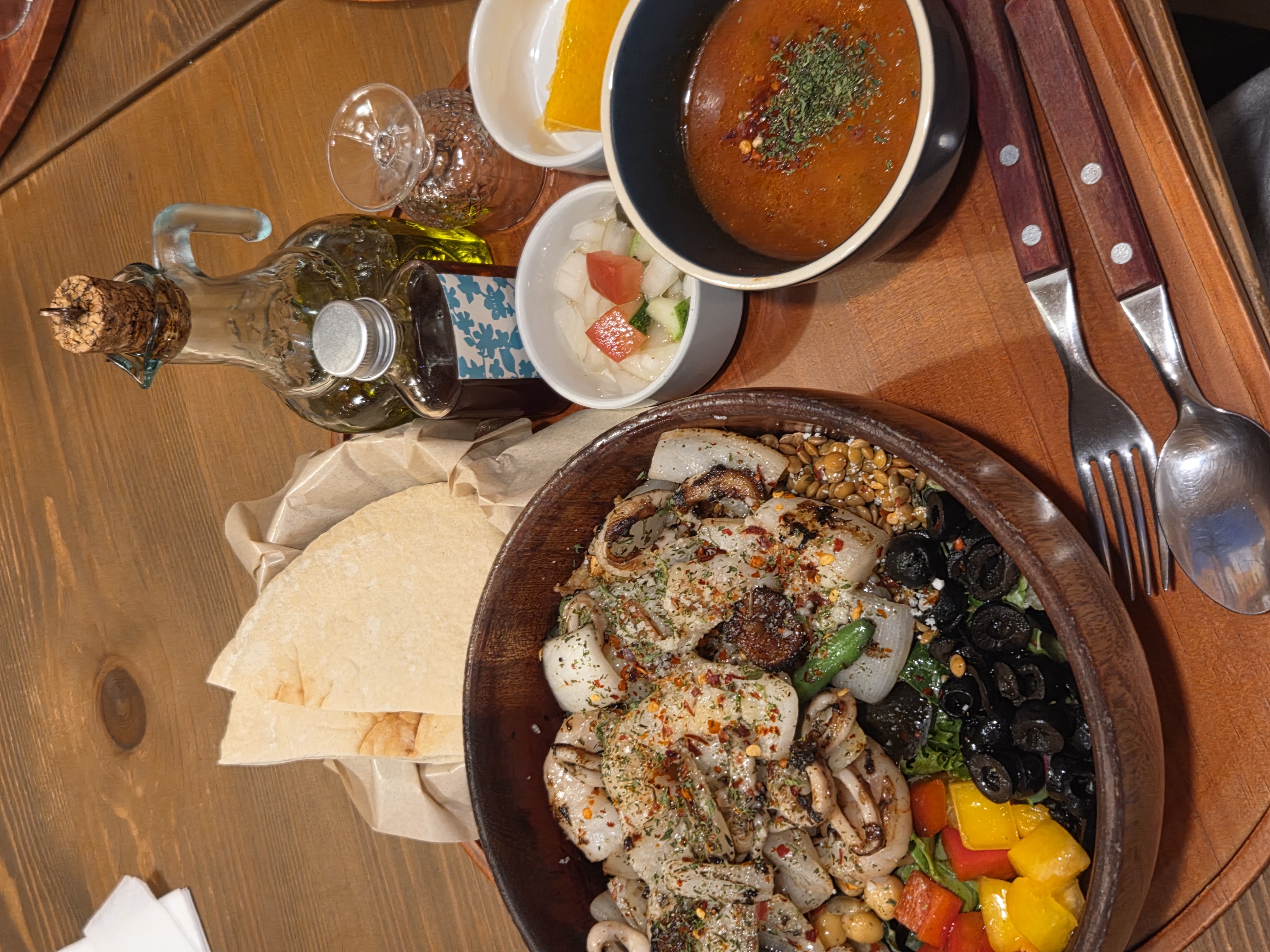 새우와 오징어에 불맛을 입혀서 그릭샐러드에 섞어낸 요리