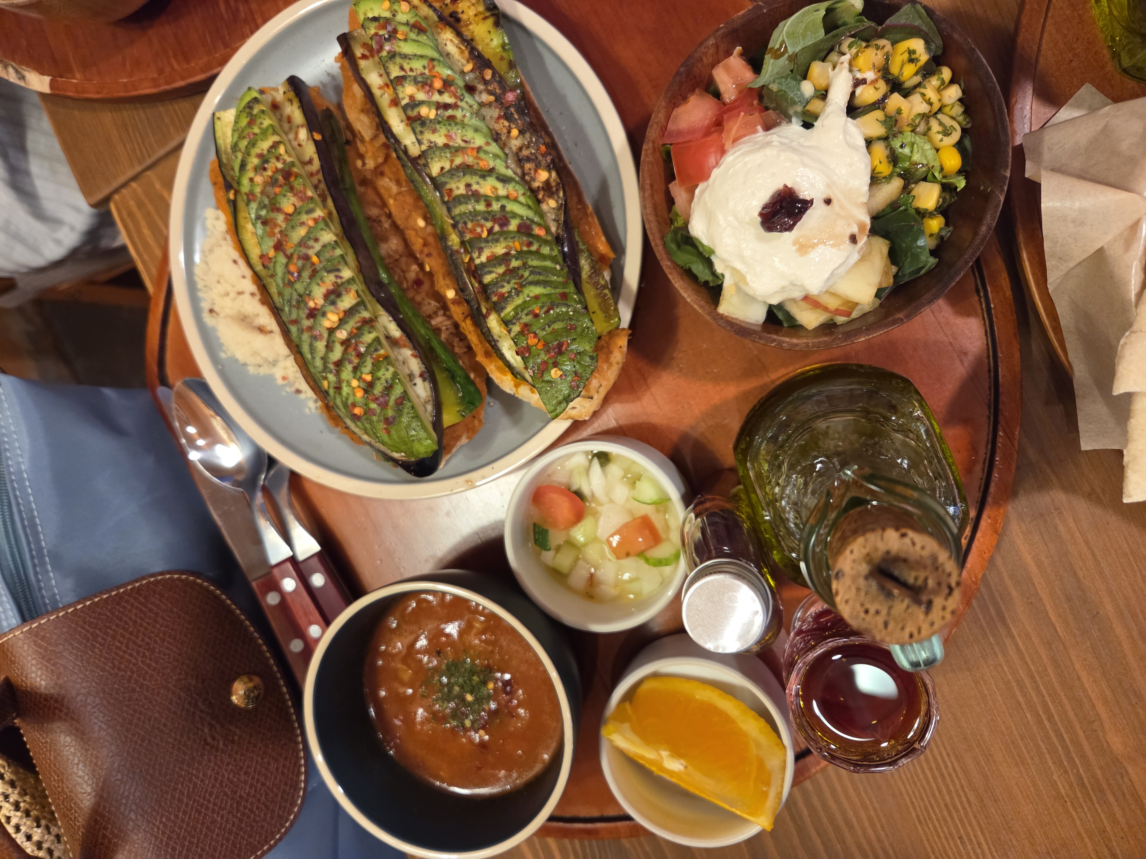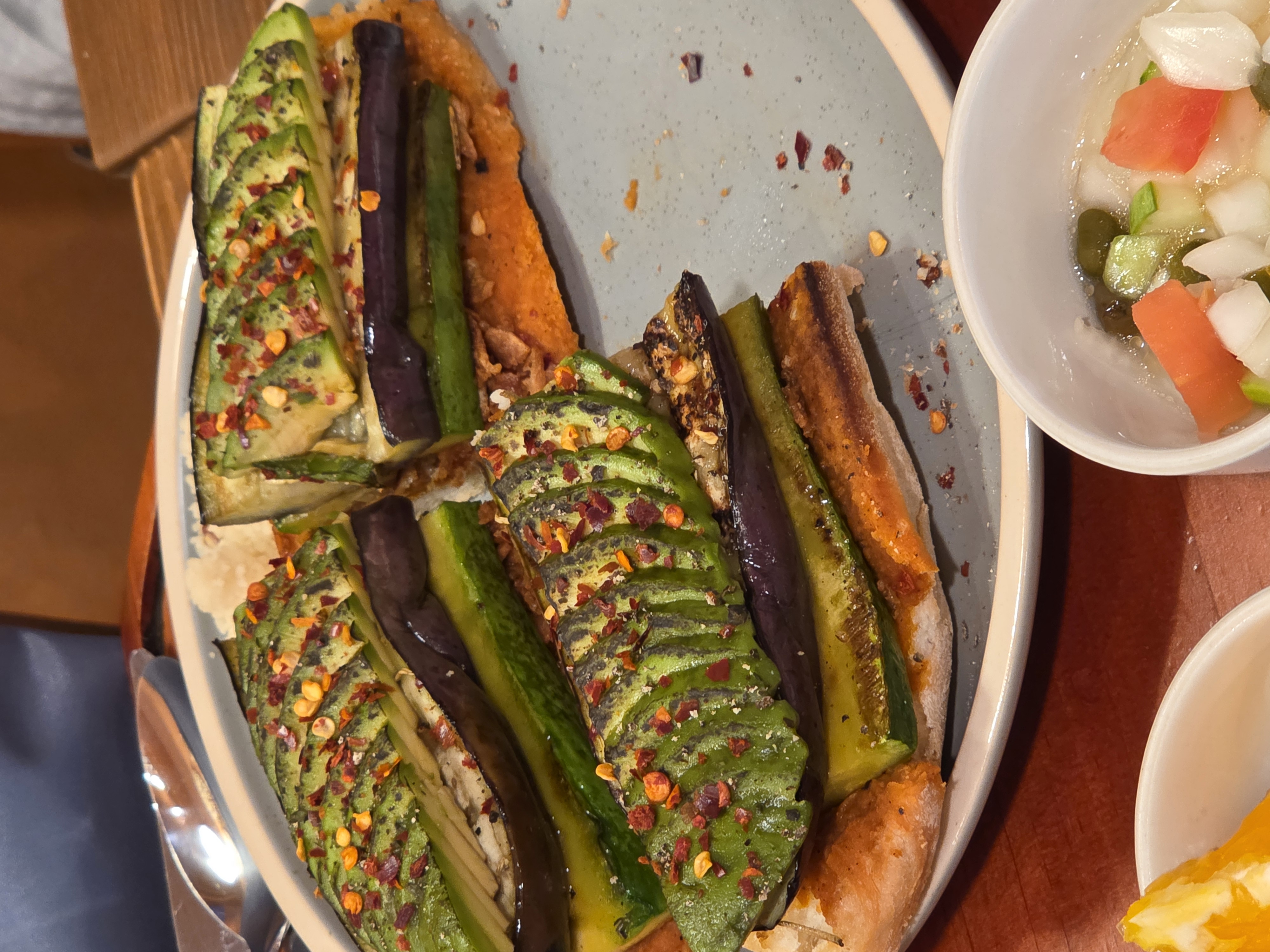 아보카도, 구운 가지, 구운 애호박을 채즙 뿌린 바게트 위에 올려서 낸 오픈 샌드위치