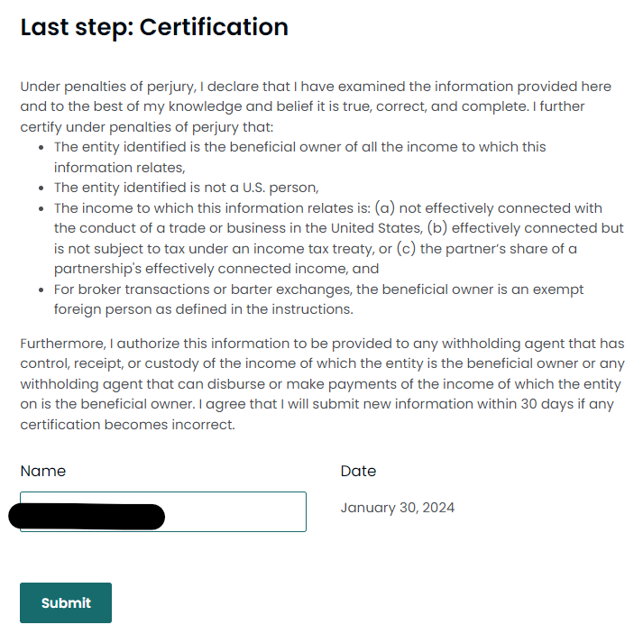 대충, 나 세금 안내는 사람 맞고 거짓말 하는거 아닙니다! 미국의 과세 대상이 아닙니다!! 하는 것에 싸인을 한다.
