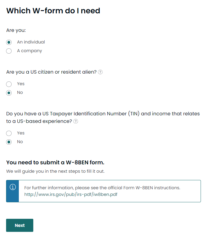 1. 미국 ➡️ 나는 미국에 세금을 내는 시민권자가 아니다. 이를 증명하는 W-8ben 코드를 등록 한다. (방법은 아래에)