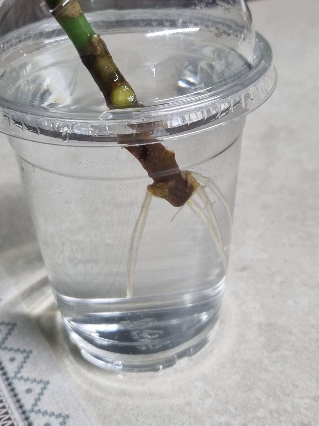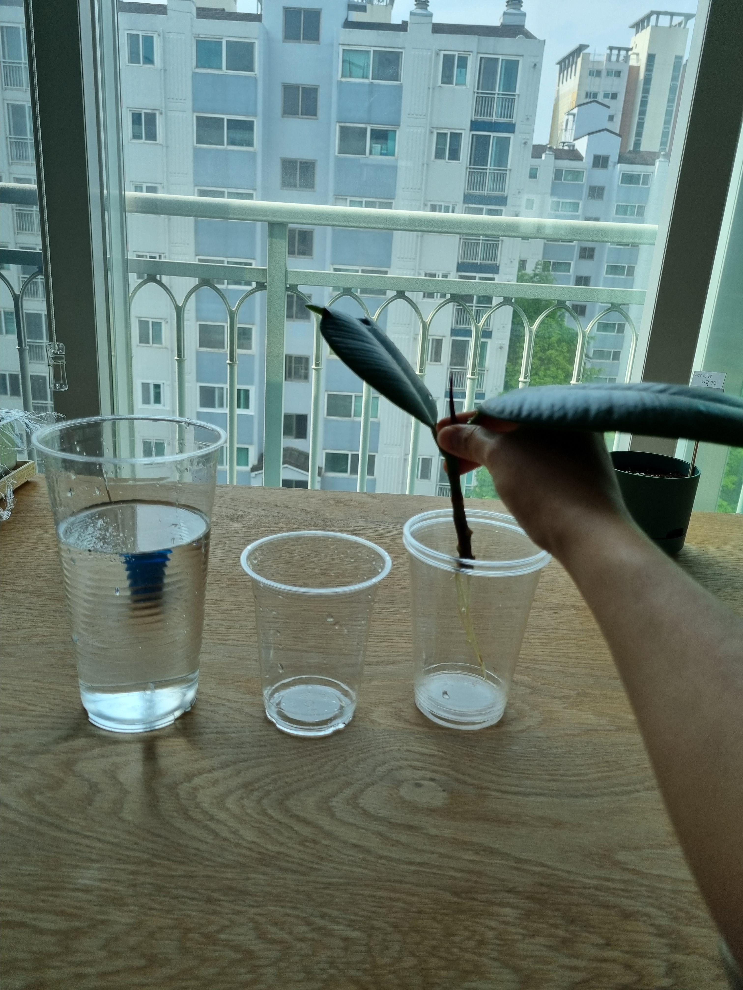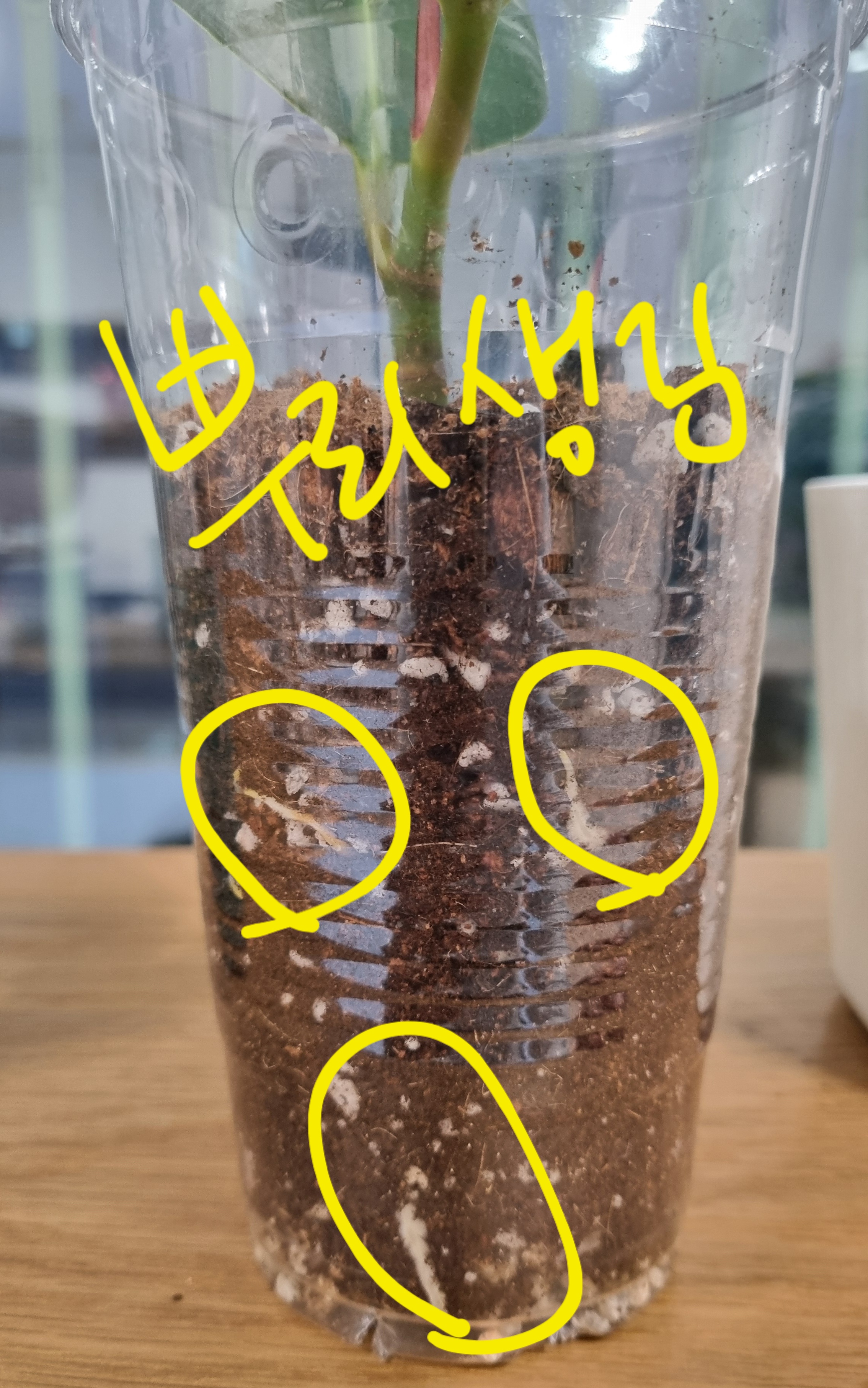 집에 가져와서 이렇게 일회용 컵에 구멍을 내고 흙으로 삽목을 시도했는데, 내가 그 과정에 뿌리 하나를 끊어버리고 만다.