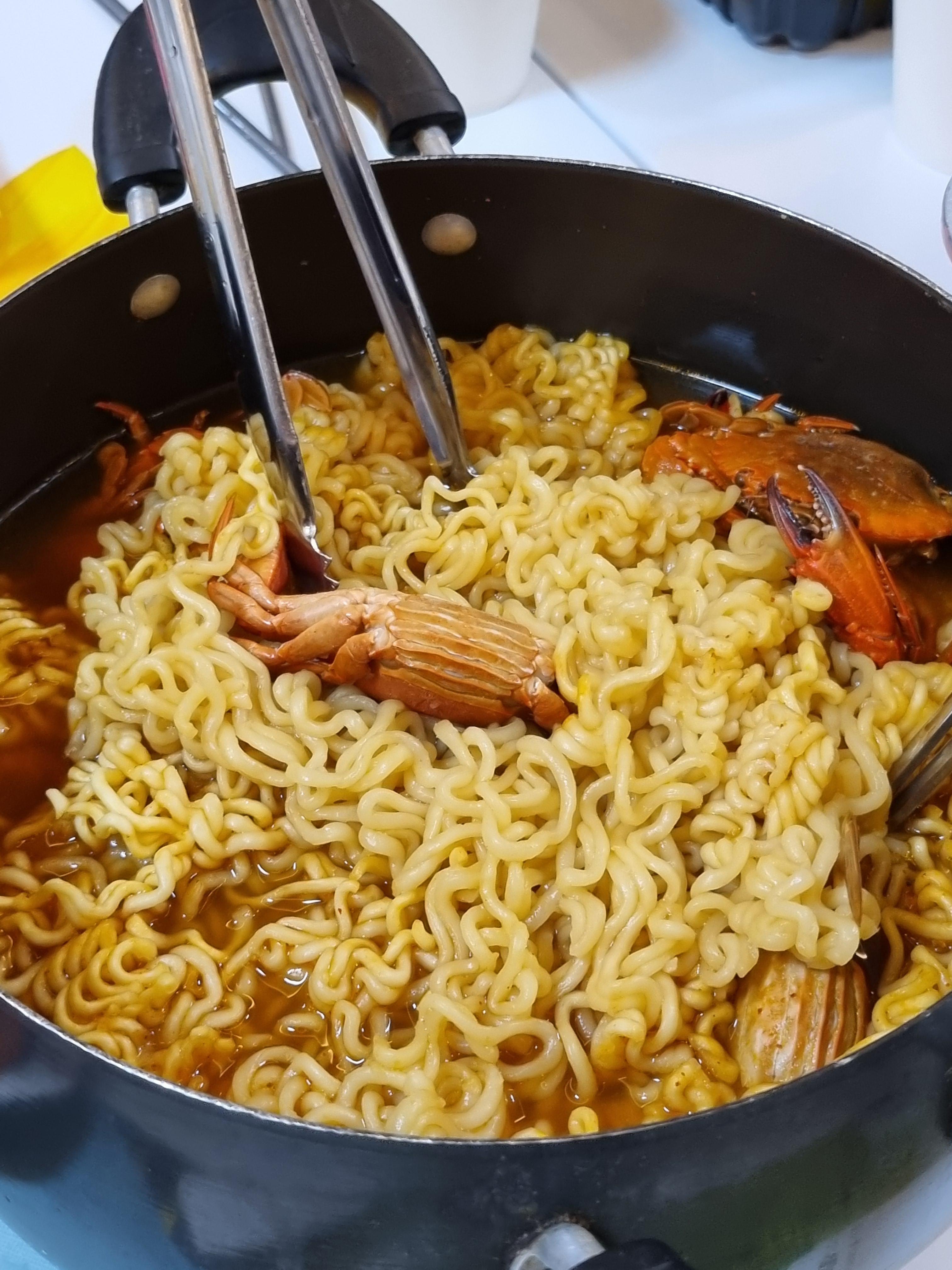 소라 삶은 물에 라면을 끓였고 쪄먹기 애매한 작은 게들도 같이 넣었다.