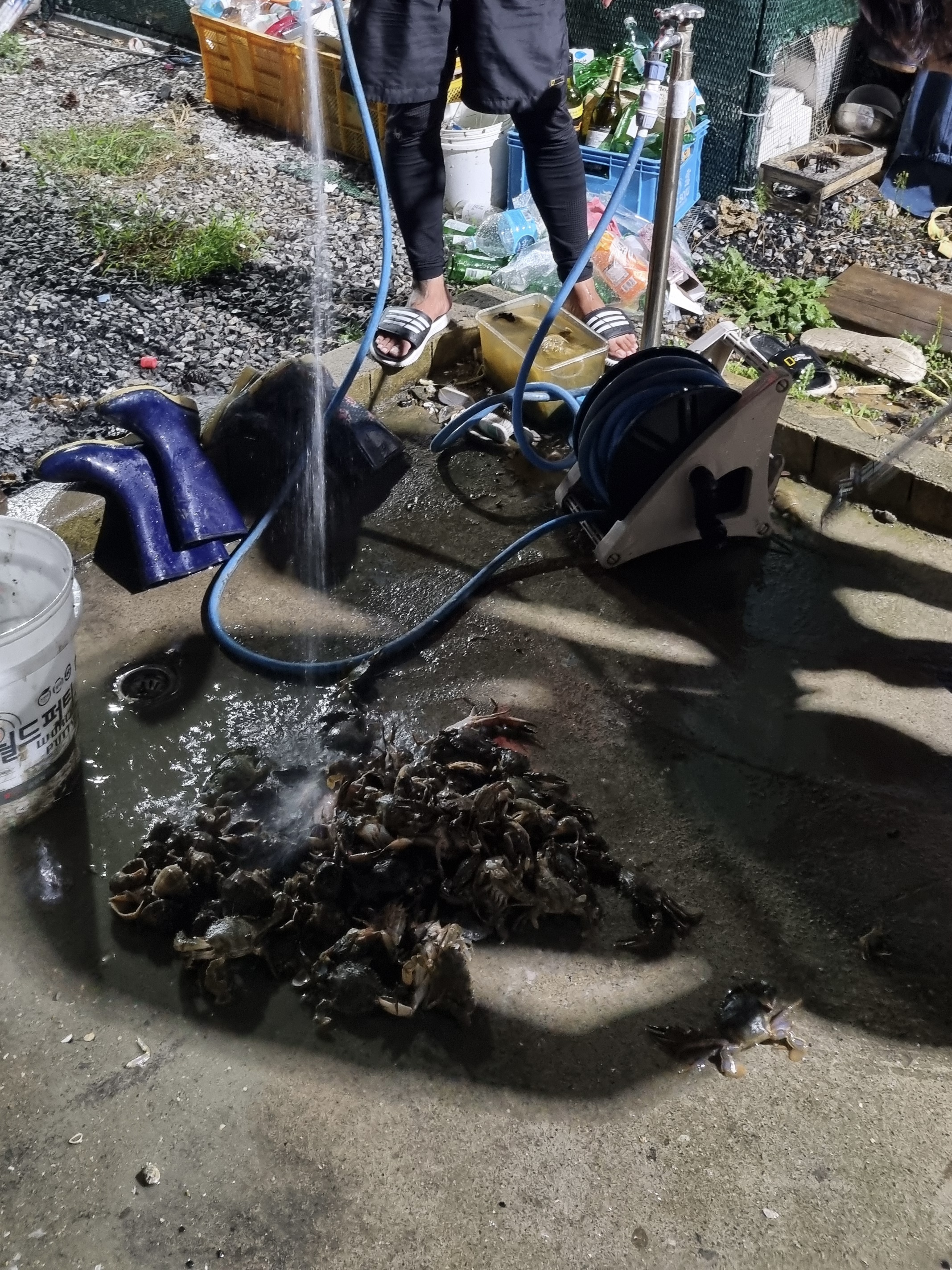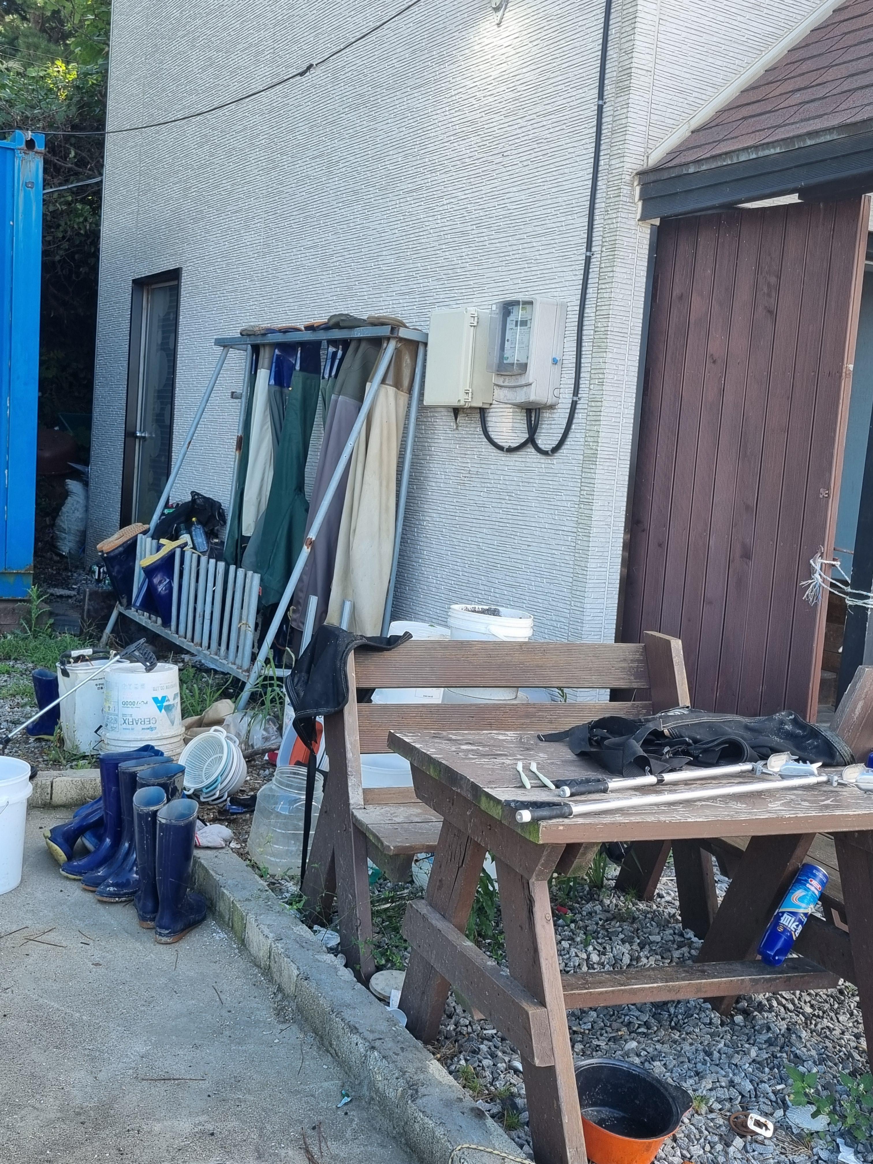 펜션 뒤의 조업장 같은 곳에서 주방을 쓸 수 있게 해주셔서 게도 찌고 소라도 삶음