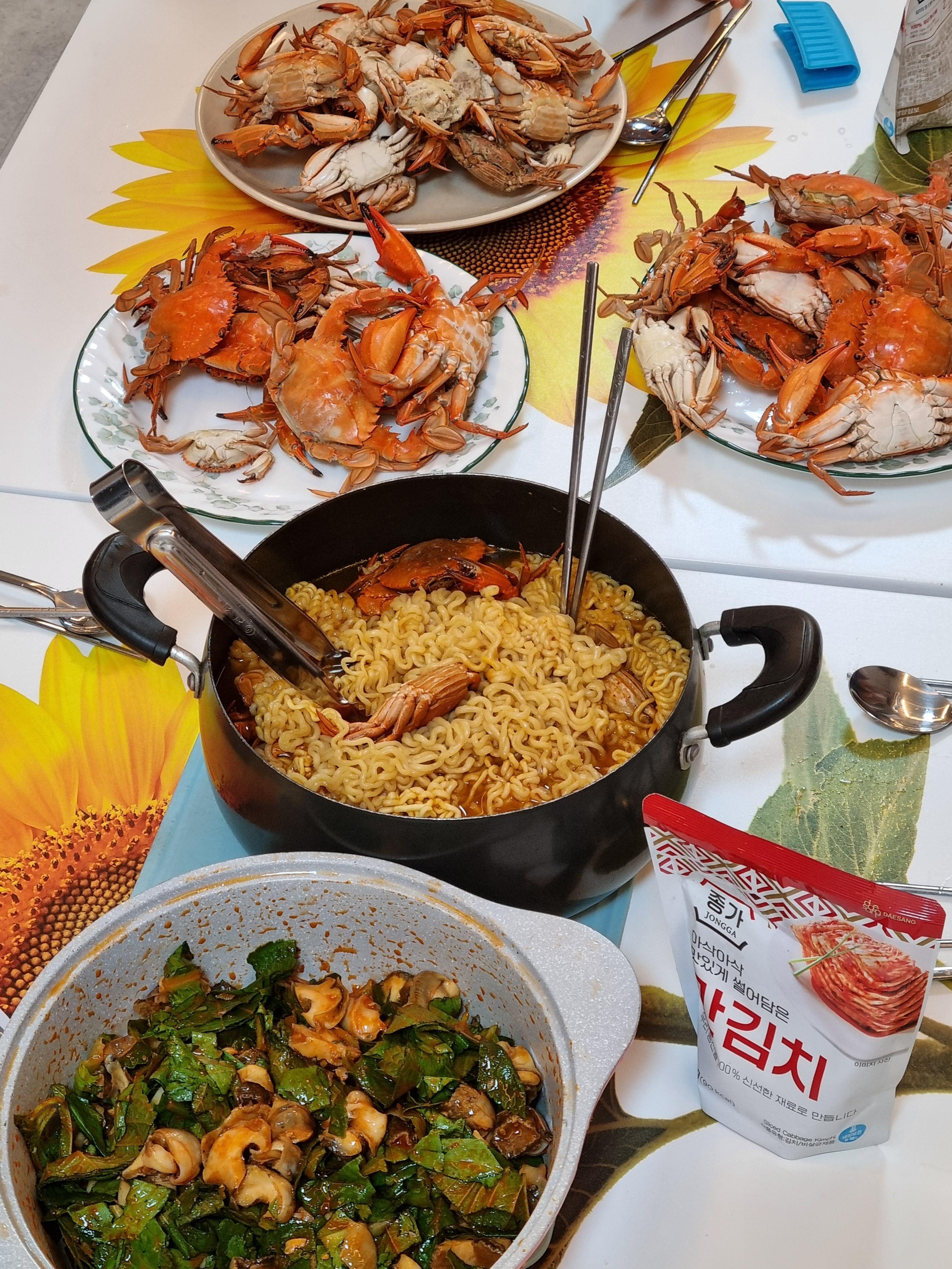 소라 삶은 물에 라면을 끓였고 쪄먹기 애매한 작은 게들도 같이 넣었다.