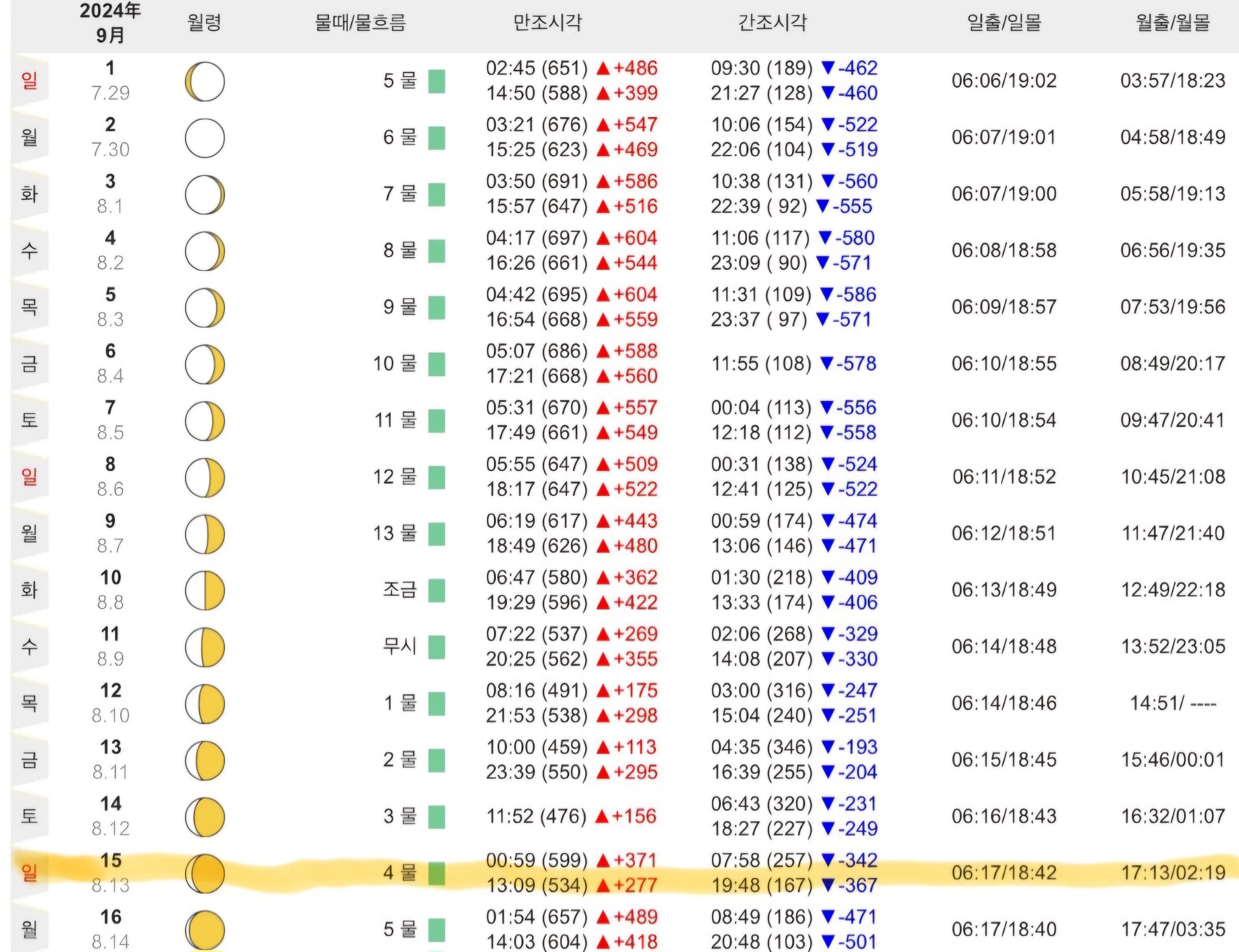 우리가 예약한 9월 15일은 4물, 흔히들 ‘첫물때’라고 부르는 때라고 하는데 소라가 잘 잡히기 시작하는 시점이라고 한다.