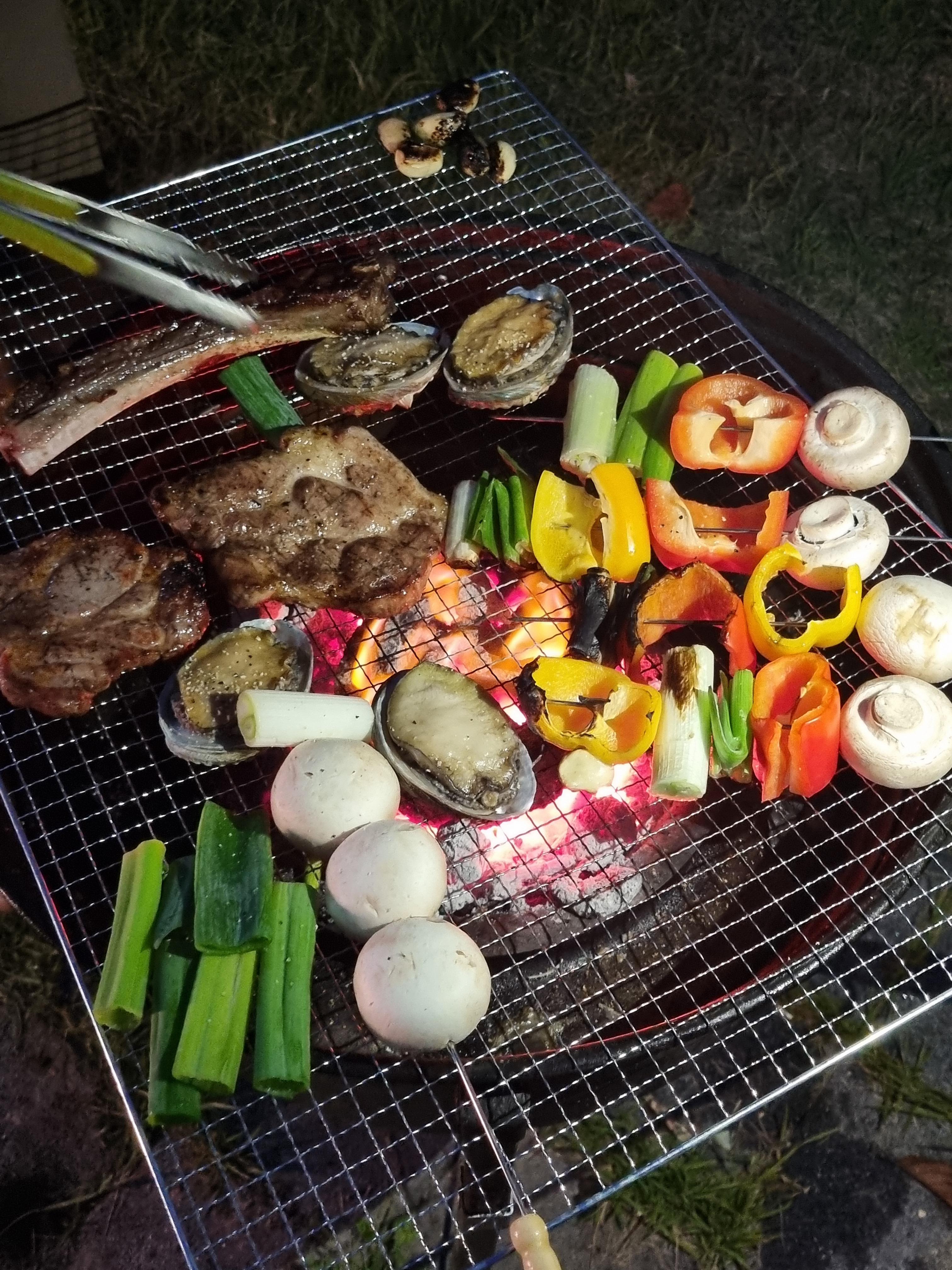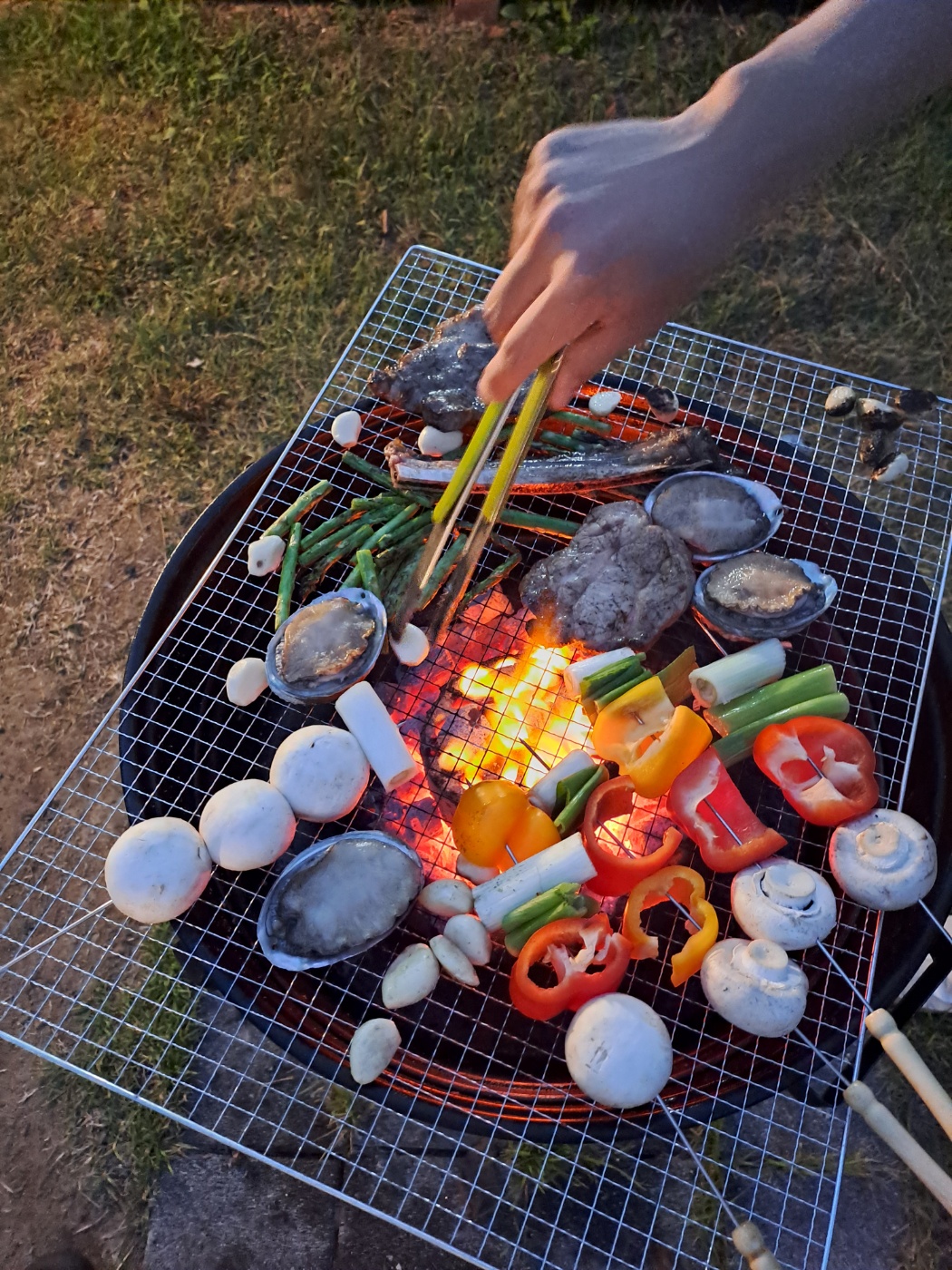 캠핑장 그릴 위에 올려놓으니 사이즈가 딱 맞다.