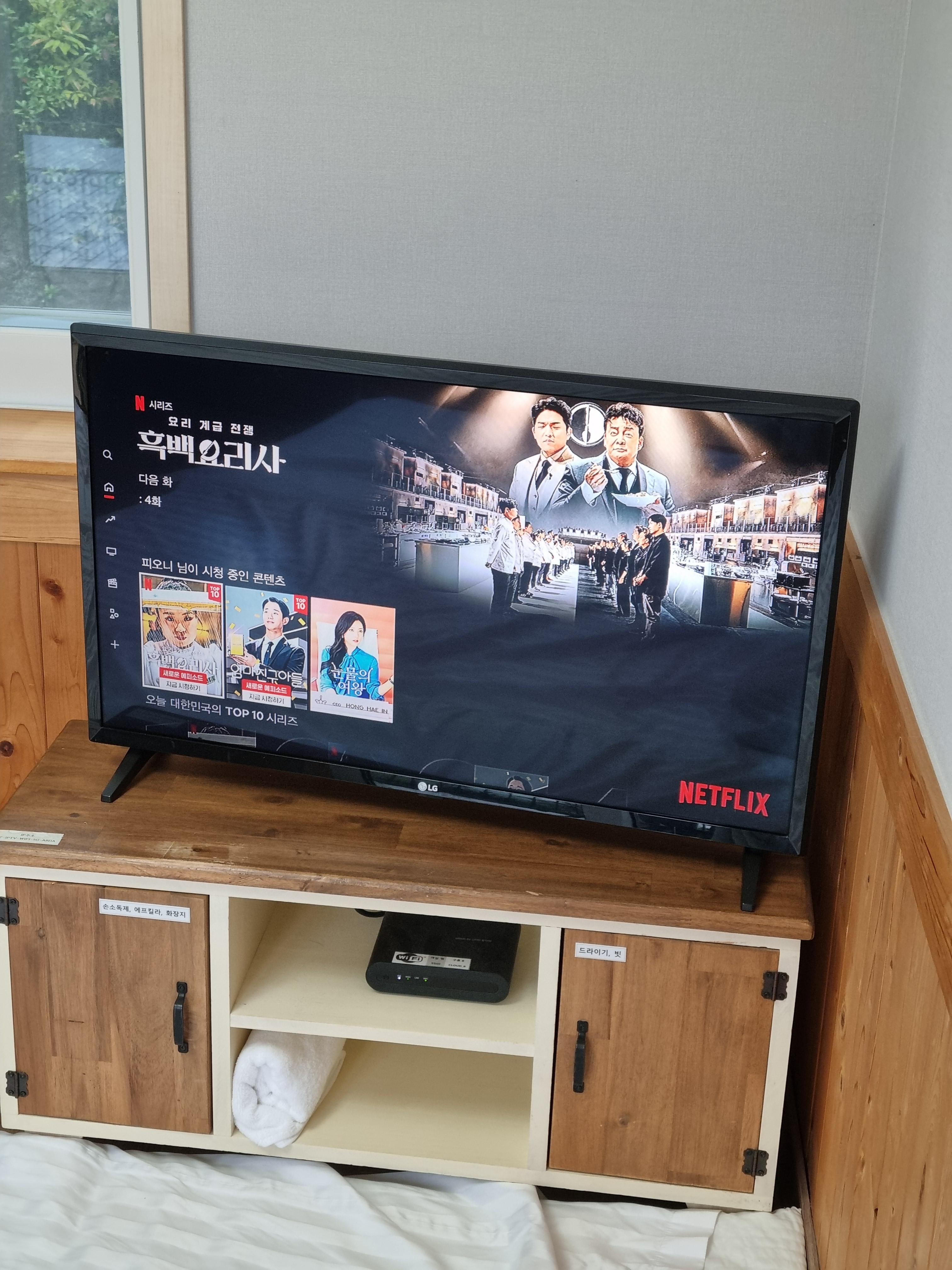침실에는 스마트 티브이가 있는데, 넷플릭스와 유튜브가 모두 이용 가능하다.