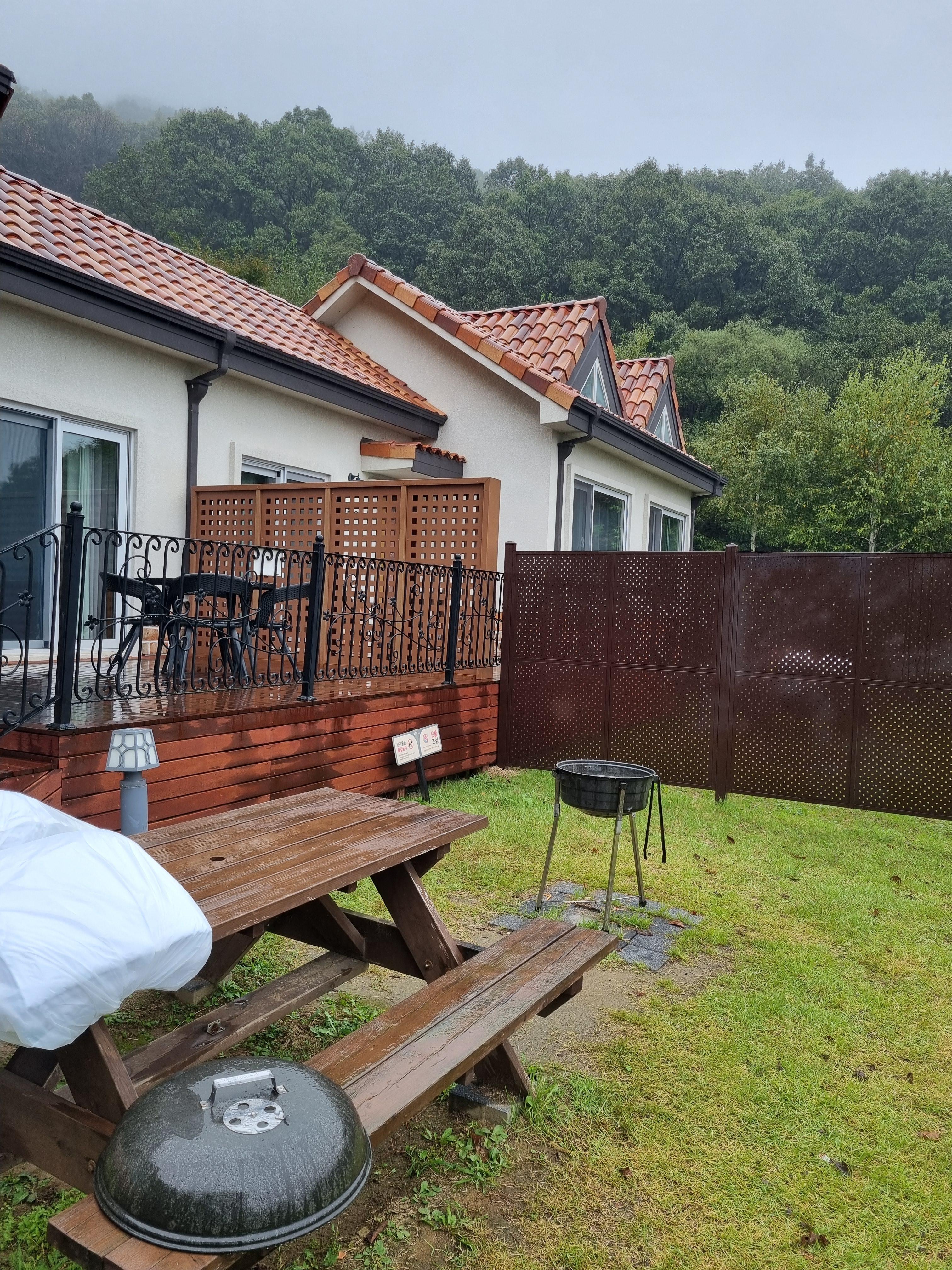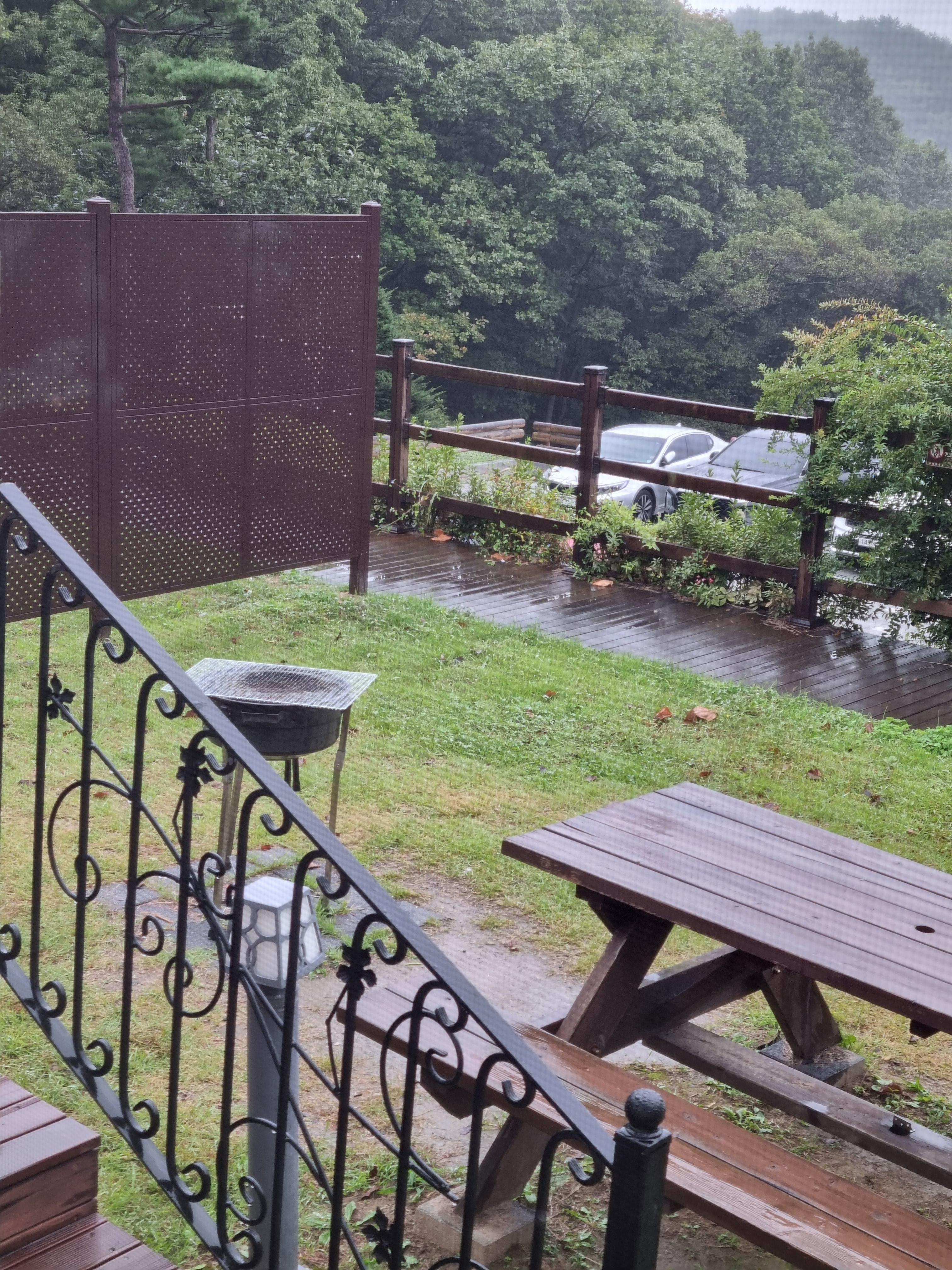 바로 뒷 테라스에 테이블이 하나 있고, 또 계단을 내려가면 있는 잔디정원에도 바베큐 하면서 옆에서 식사 가능한 테이블이 있다.