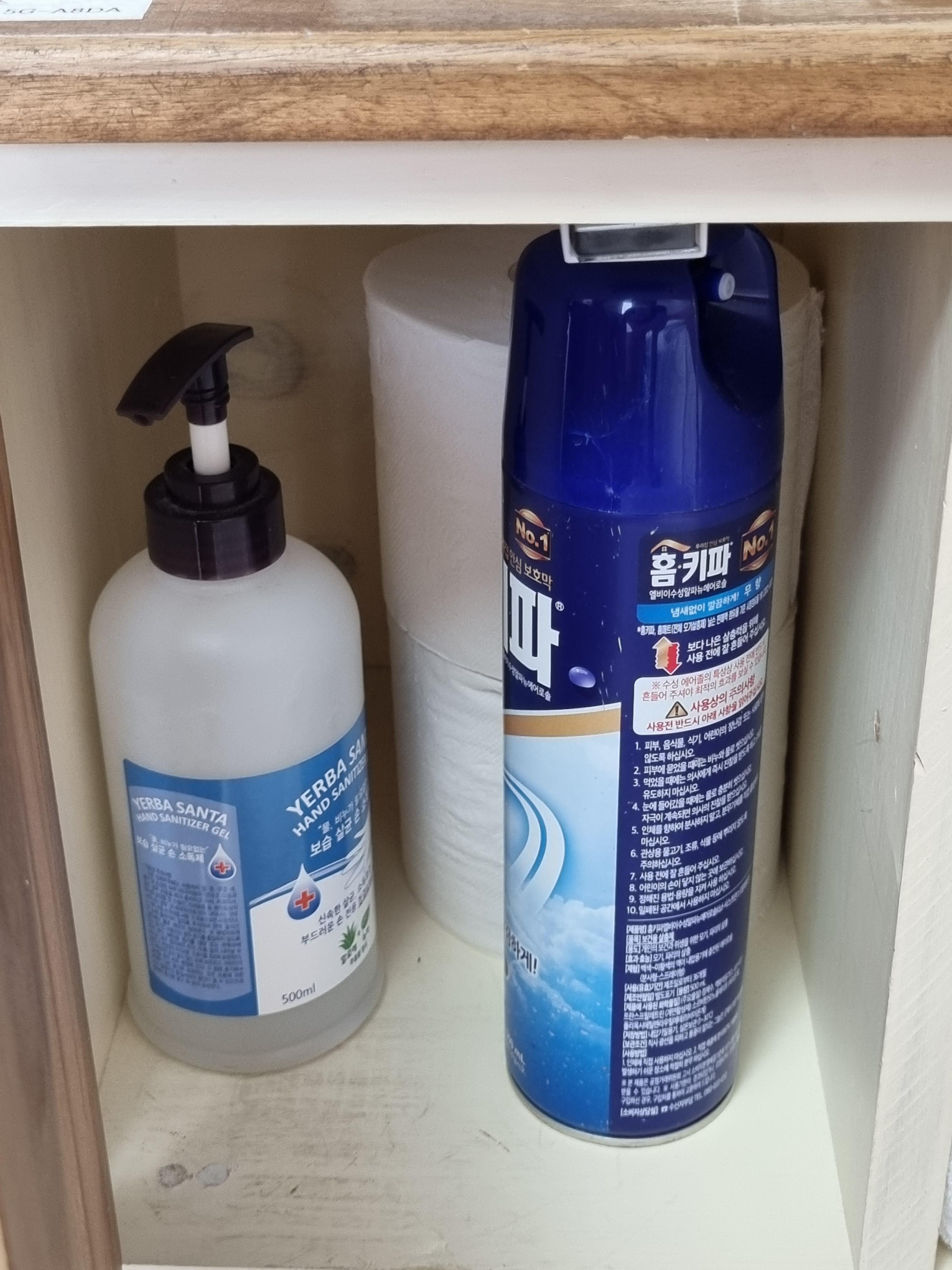 여분의 화장지, 손소독제와 에프킬러가 준비되어 있다.