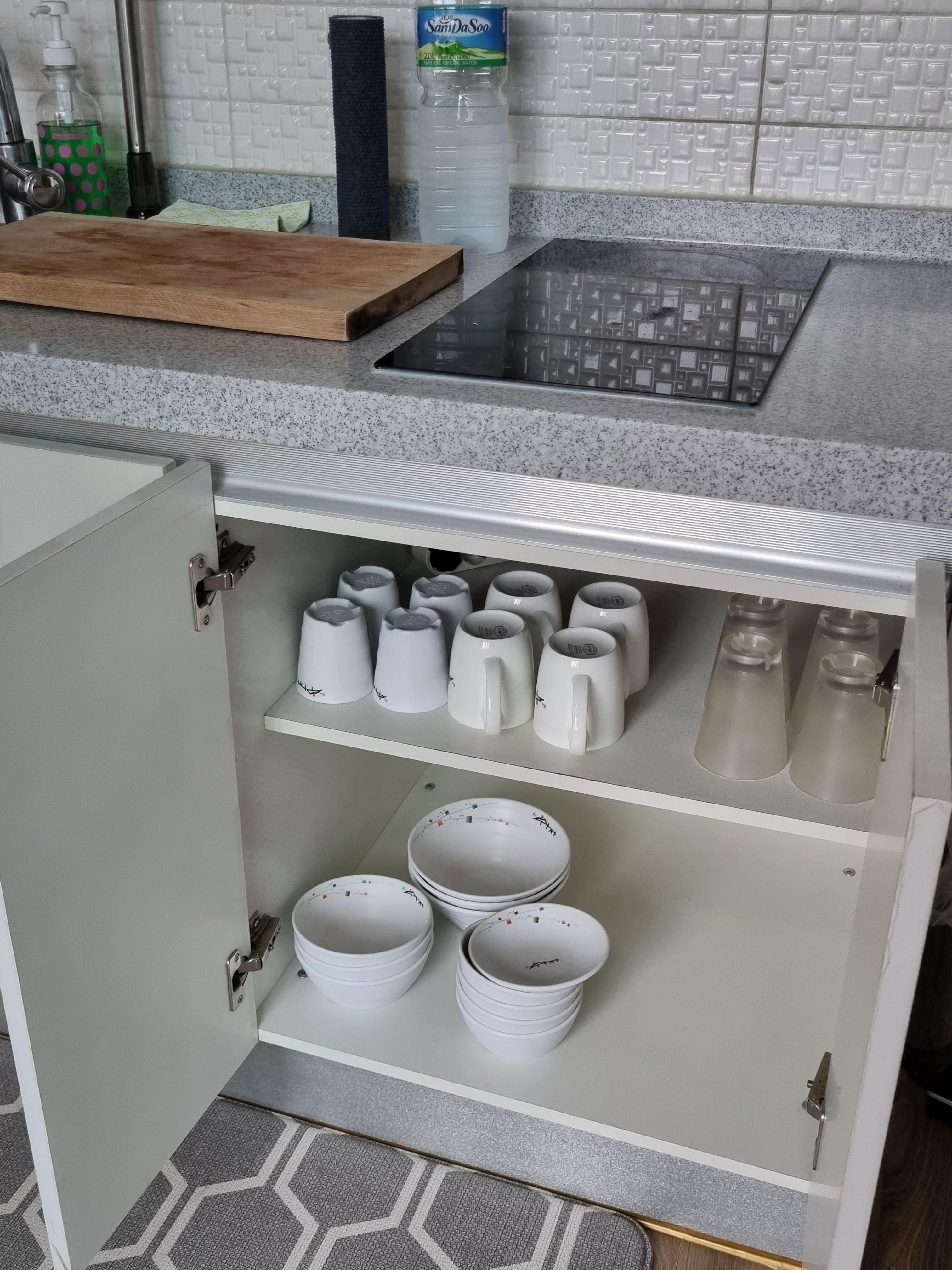 주방 쪽에는 인덕션도 있고 상하부장을 열어보면 각종 그릇과 식기류가 기본적으로 구비되어 있다.
