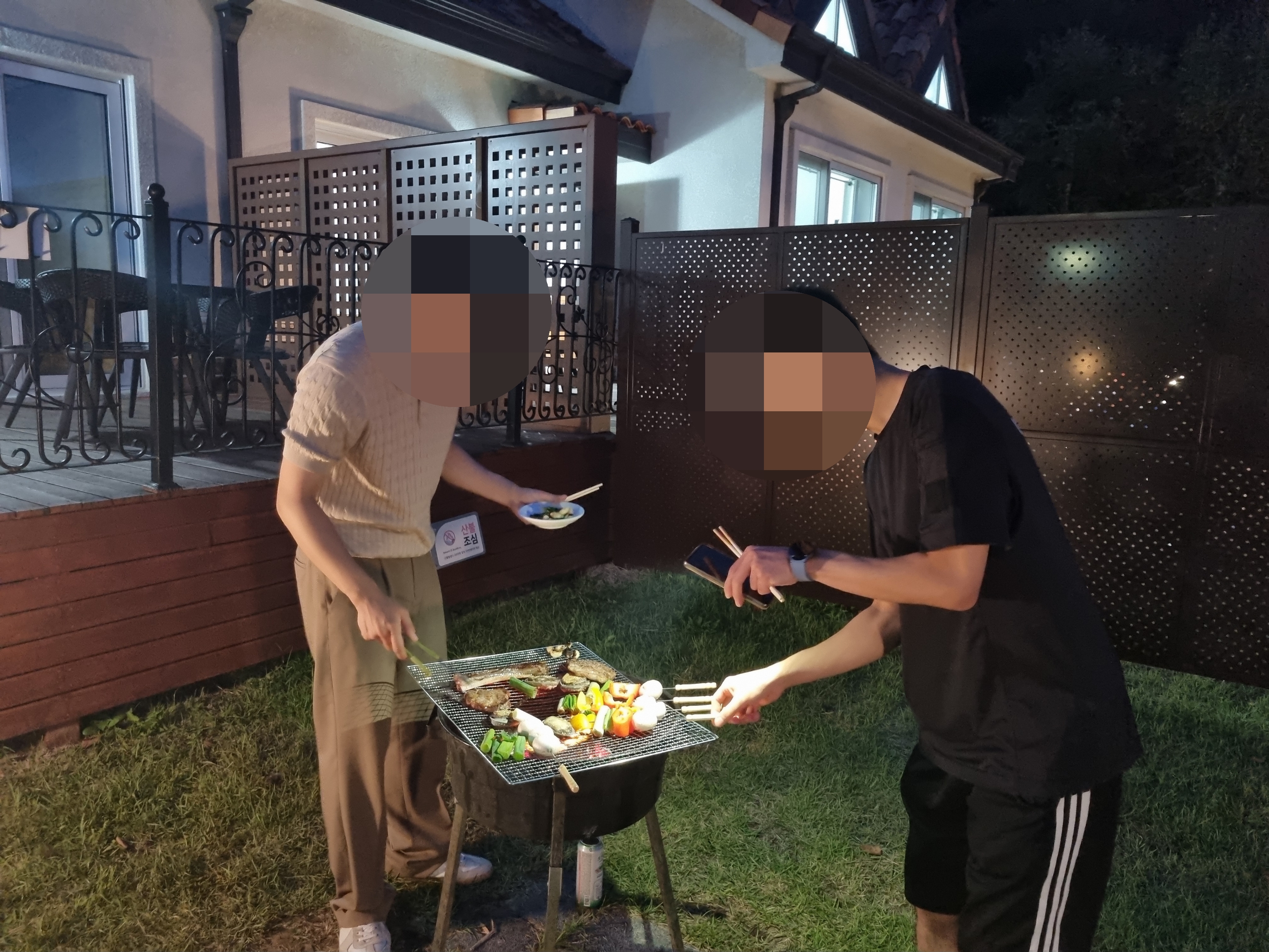 다이소에서 사 온 불판과 바베큐 꼬치로 성공적인 바베큐를 하는 중