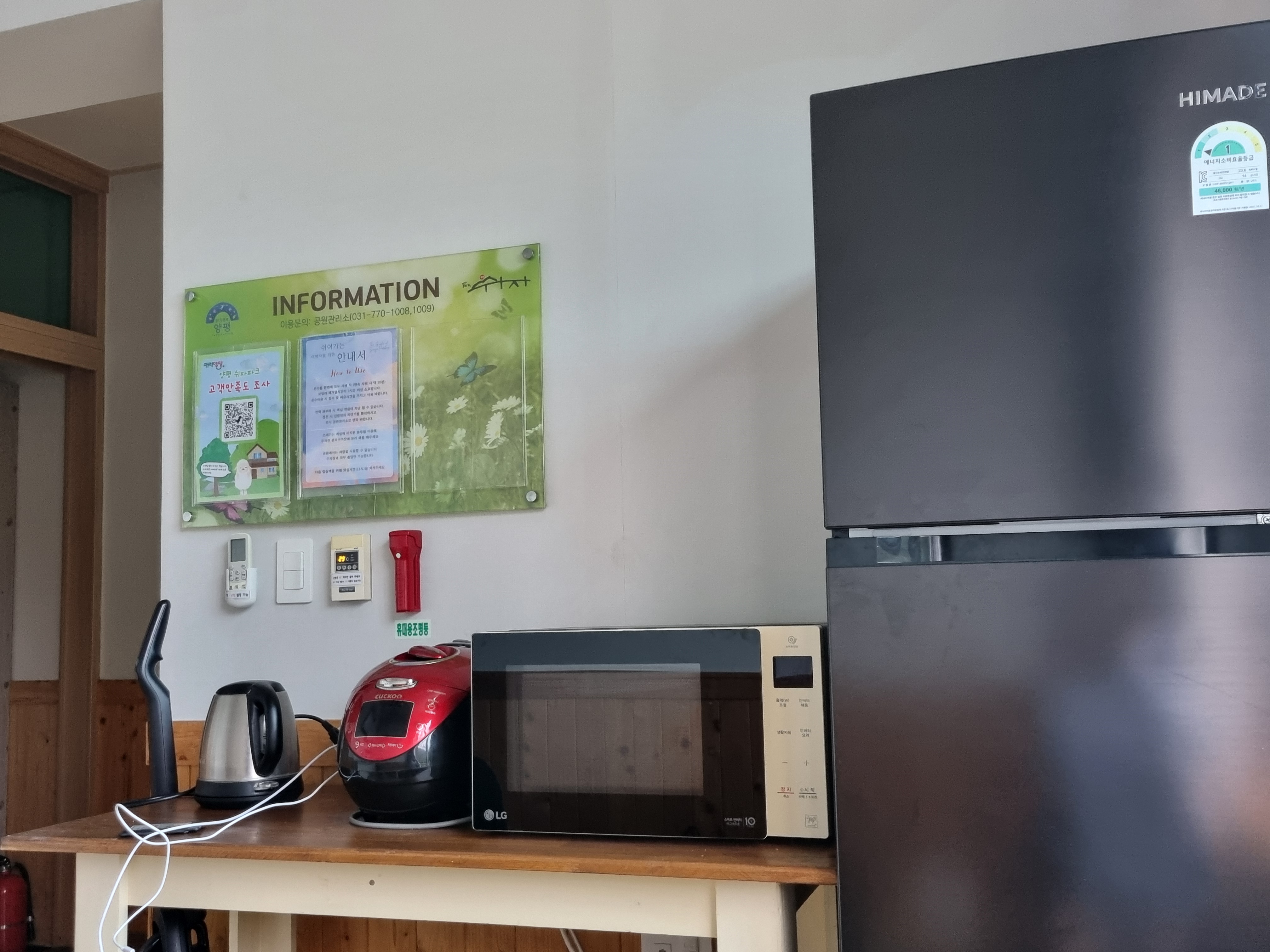 거실에는 냉동, 냉장이 모두 가능한 냉장고, 물 끓이는 포트, 밥솥 그리고 전자레인지가 완비되어 있다.