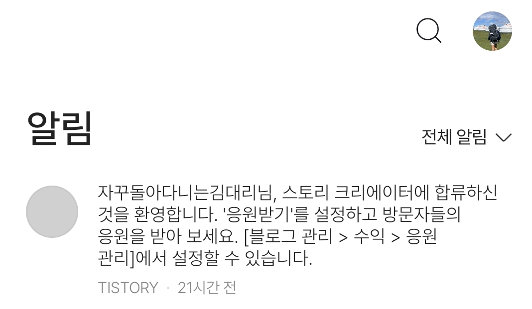 팔로워수도 많지 않고 가끔 담당자분이 다음 메인에 걸어 주시는 것이 유일한 이벤트인 작은 곳인데 어제 무심코 열어본 어플 알림에 이런 게 와 있었다.