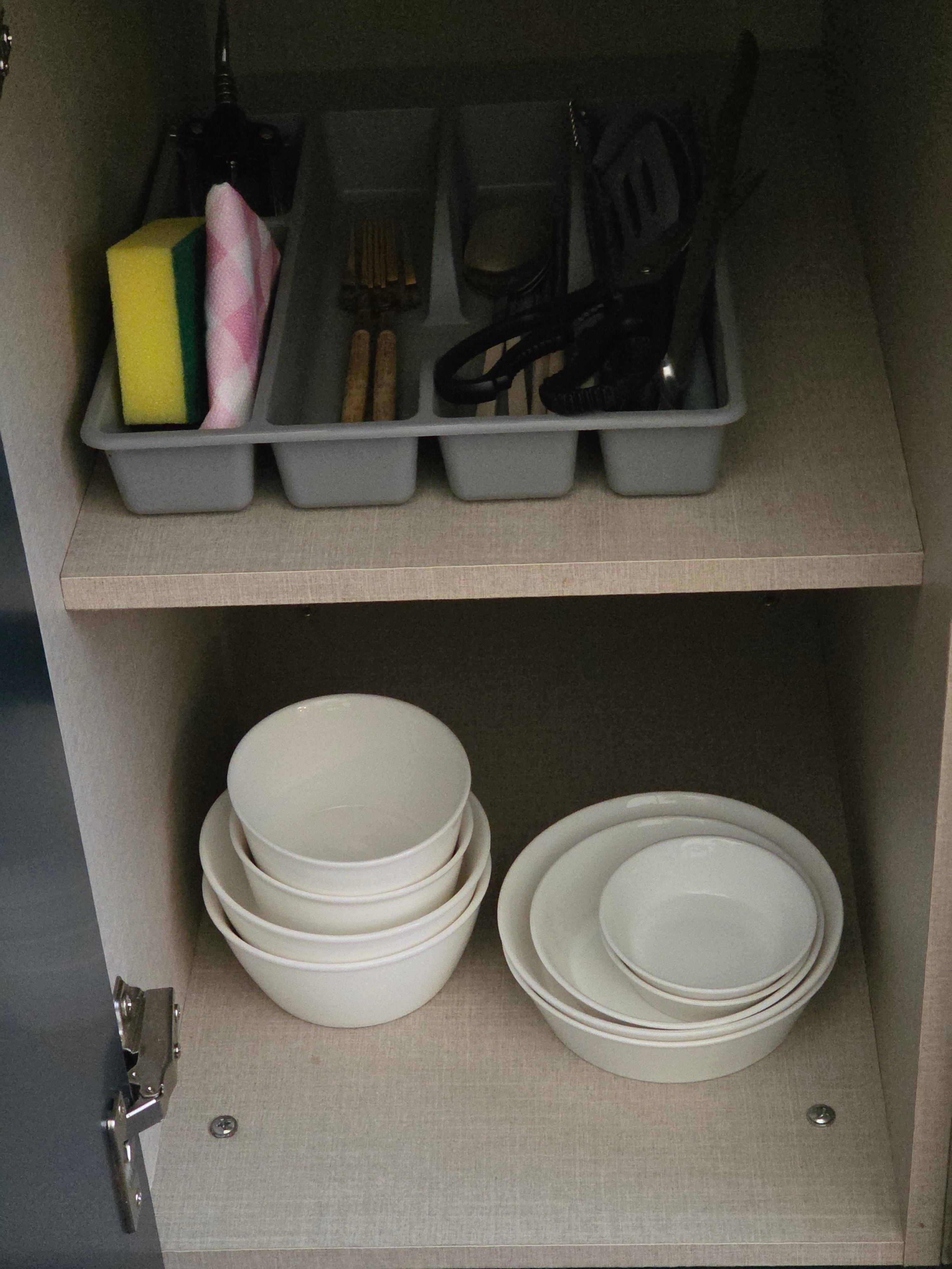 맞은편에는 전기 히터와 각종 주방 기구들이 있다.