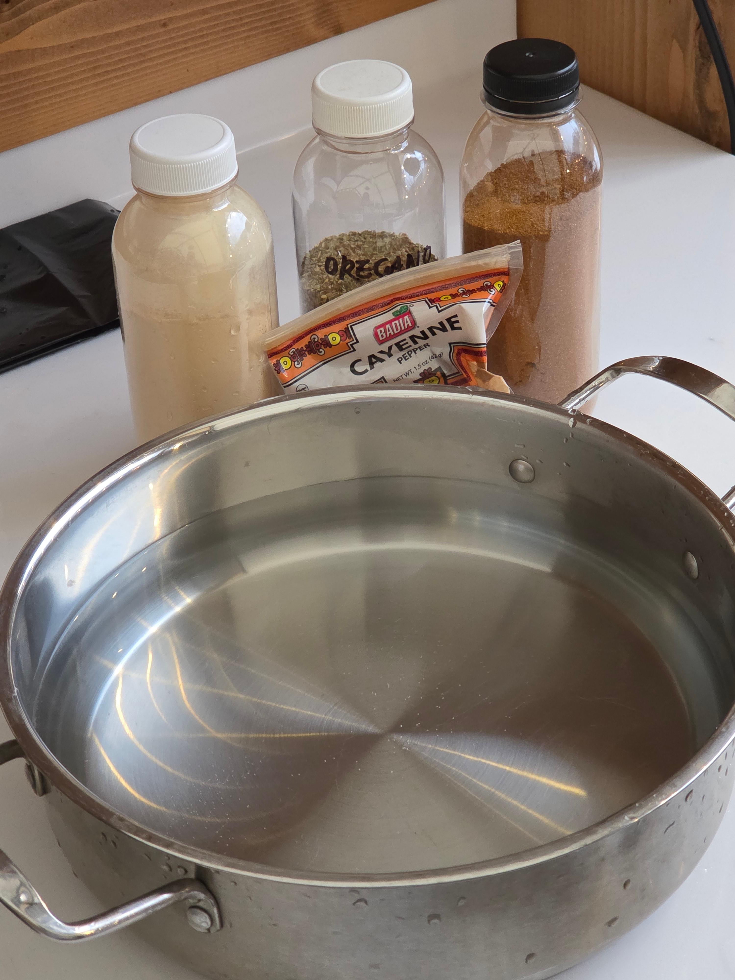 재료를 1차 익혀줄 냄비에 케이준 파우더, 오레가노, 월계수잎, 마늘파우더 등을 넣고 보글보글 끓여준다