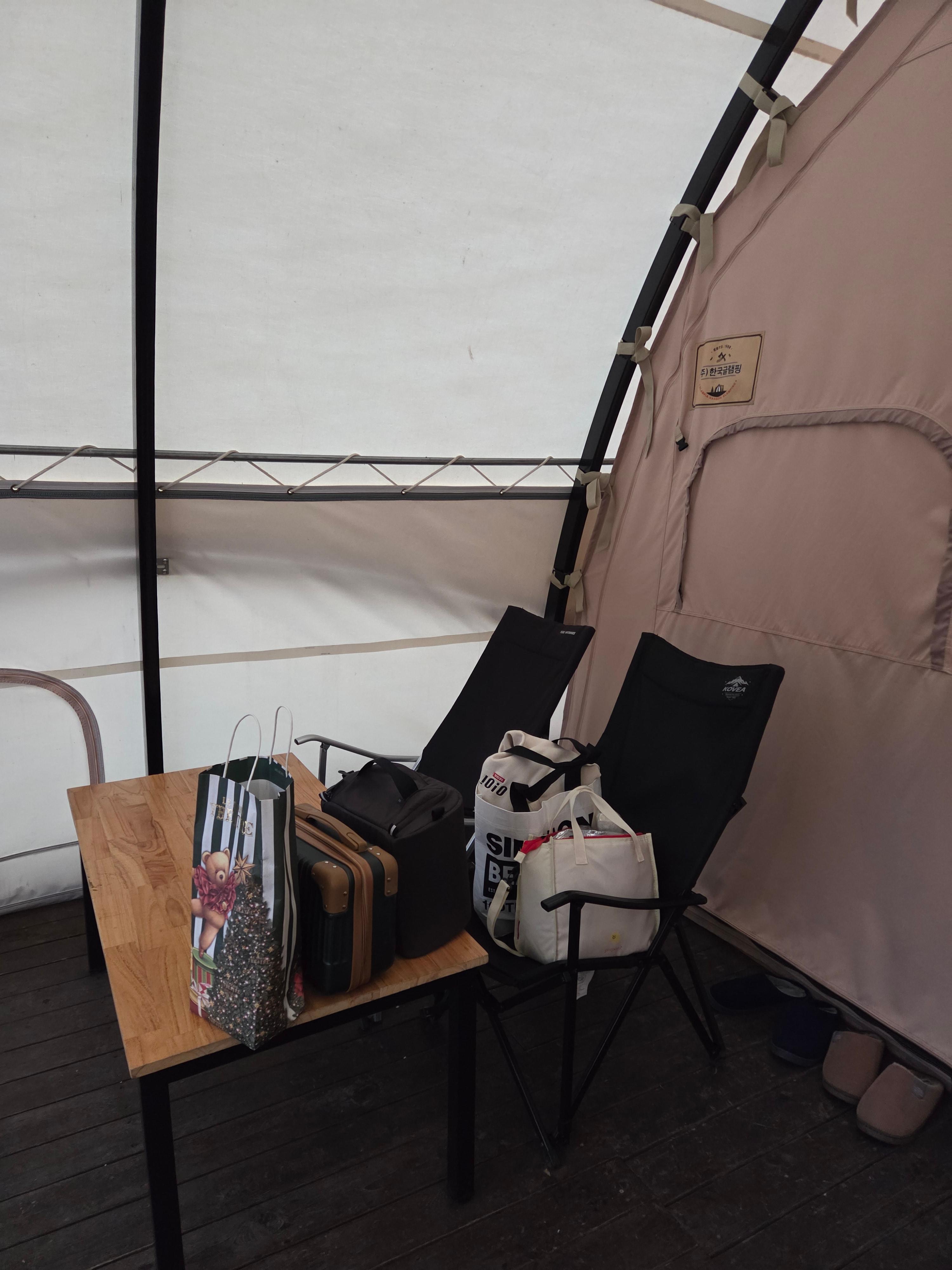 텐트 안에도 식사를 할 수 있게 테이블과 캠핑 의자가 비치되어 있고